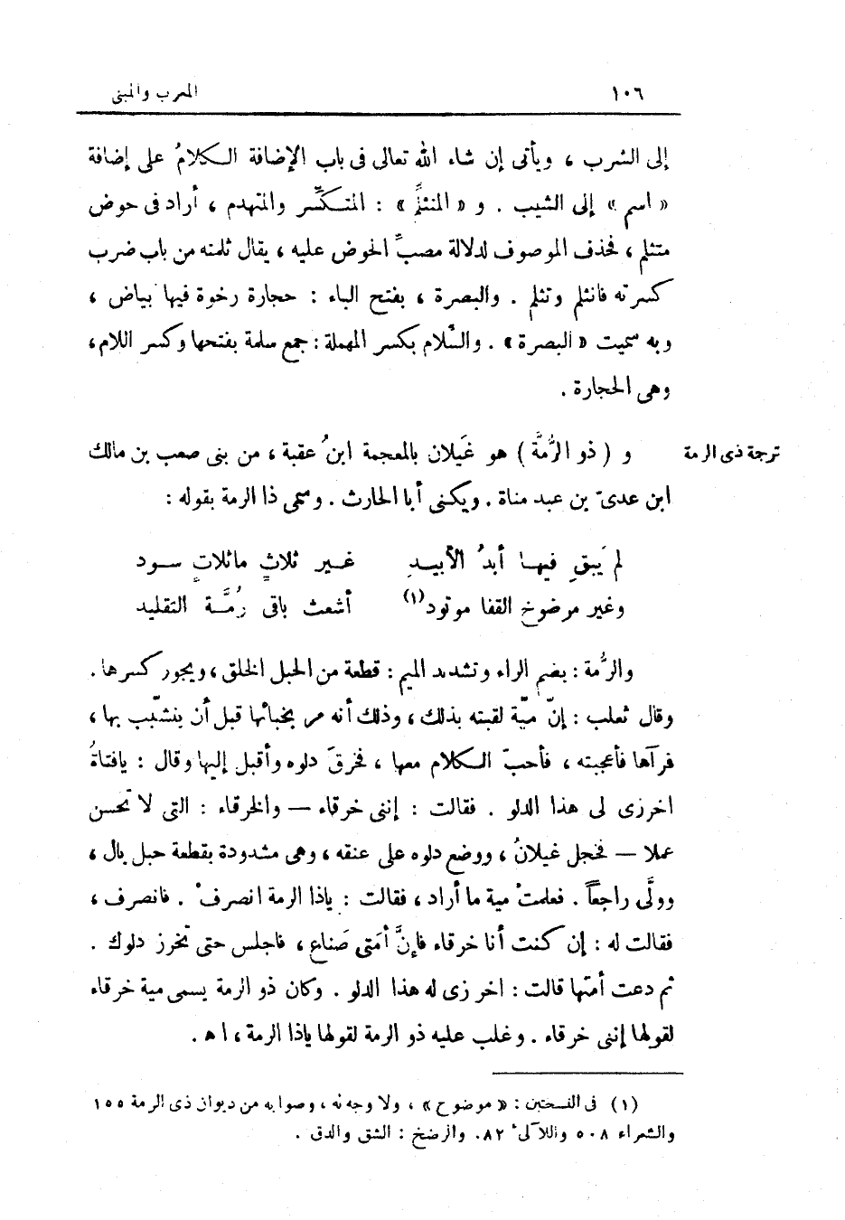 وَالسَّلَام بِكَسْر الْمُهْملَة جمع سَلمَة بِفَتْحِهَا وَكسر اللَّام وَهِي الْحِجَارَة وَذُو الرمة هُوَ غيلَان بِالْمُعْجَمَةِ ابْن عقبَة من بني صَعب بن مَالك بن عدي بن عبد مَنَاة ويكنى أَبَا الْحَارِث وَسمي ذَا الرمة بقوله
