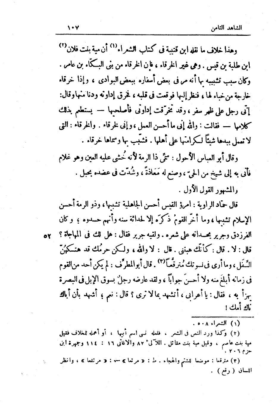 وَقد تخرقت إدواتي فأصلحيها يستطعم بذلك كَلَامهَا فَقَالَت وَالله إِنِّي مَا أحسن الْعَمَل وَإِنِّي لخرقاء والخرقاء الَّتِي لَا تعْمل بِيَدِهَا شَيْئا لكرامتها على أَهلهَا فشبب بهَا وسماها خرقاء وَقَالَ أَبُو الْعَبَّاس الْأَحول سمي ذَا الرمة لِأَنَّهُ خشِي عَلَيْهِ الْعين وَهُوَ غُلَام فَأتي بِهِ إِلَى شيخ من الْحَيّ وصنع لَهُ معَاذَة وشدت فِي عضده بِحَبل وَالْمَشْهُور القَوْل الأول قَالَ حَمَّاد الراوية امْرُؤ الْقَيْس أحسن الْجَاهِلِيَّة تَشْبِيها وَذُو الرمة أحسن الْإِسْلَام تَشْبِيها وَمَا أخر الْقَوْم ذكره إِلَّا لحداثة سنه وَأَنَّهُمْ حسدوه وَكَانَ الفرزدق وَجَرِير يحسدانه على شعره ولقيه جرير فَقَالَ هَل لَك فِي المهاجاة قَالَ لَا قَالَ كَأَنَّك هبتني قَالَ لَا وَالله وَلَكِن حَرمك قد هتكهن السّفل وَمَا أرى فِي نسوتك مترقعا قَالَ أَبُو الْمطرف لم يكن أحد من الْقَوْم فِي زَمَانه أبلغ مِنْهُ وَلَا أحسن جَوَابا وَلَقَد عَارضه رجل بسوق الْإِبِل فِي الْبَصْرَة يهزأ بِهِ فَقَالَ يَا أَعْرَابِي أَتَشهد بِمَا لَا ترى قَالَ نعم أشهد بِأَن أَبَاك ناك أمك
