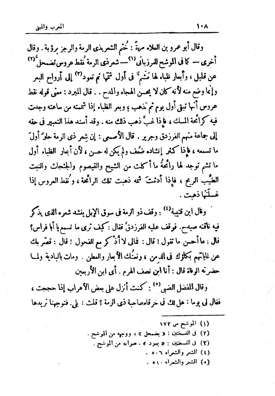 وَقَالَ أَبُو عَمْرو بن الْعَلَاء مرّة ختم الشّعْر بِذِي الرمة وَالرجز برؤبة وَقَالَ أُخْرَى كَمَا فِي الموشح للمرزباني شعر ذِي الرمة نقط عروس تضمحل عَن قَلِيل وأبعار ظباء لَهَا مشم فِي أول شمها ثمَّ تعود إِلَى أَرْوَاح البعر وَإِنَّمَا وضع مِنْهُ لِأَنَّهُ كَانَ لَا يحسن الهجاء والمدح قَالَ الْمبرد معنى قَوْله نقط عروس أَنَّهَا تبقى أول يَوْم ثمَّ تذْهب وبعر الظباء إِذا شممته من سَاعَته وجدت فِيهِ كرائحة الْمسك فَإِذا غب ذهب ذَلِك مِنْهُ وَقد أسْند هَذَا التَّعْبِير فِي حَقه إِلَى جمَاعَة مِنْهُم الفرزدق وَجَرِير قَالَ الْأَصْمَعِي إِن شعر ذِي الرمة حُلْو أول مَا تسمعه فَإِذا كثر إنشاده ضعف وَلم يكن لَهُ حسن لِأَن أبعار الظباء أول مَا تشم تُوجد لَهَا رائحه مَا أكلت من الشيح والقيصوم والجثجاث والنبت الطّيب الرّيح فَإِذا أدمت شمه ذهبت تِلْكَ الرَّائِحَة