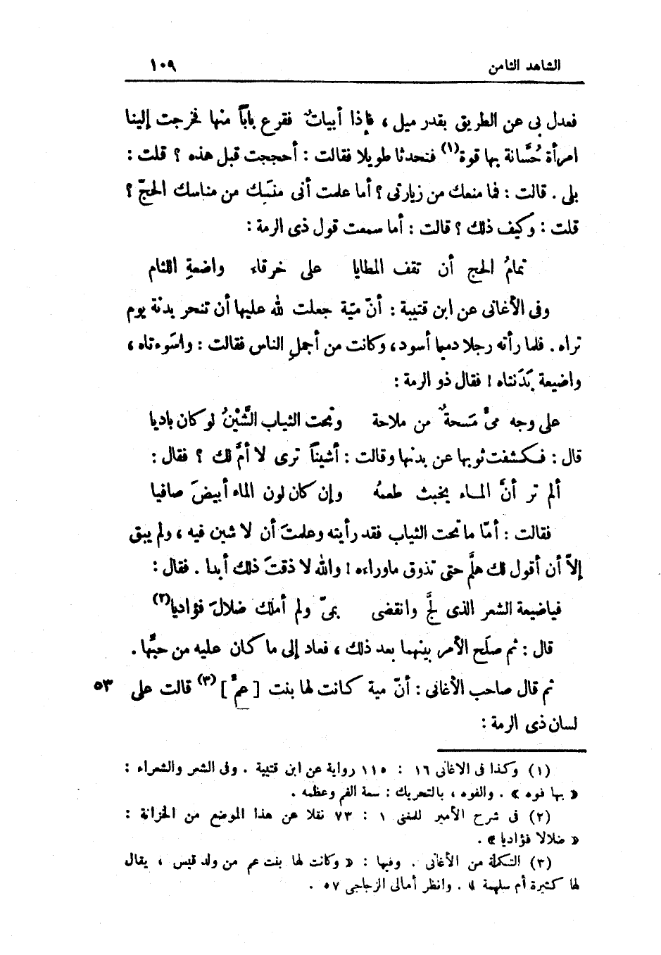 فَعدل بِي عَن الطَّرِيق بِقدر ميل فَإِذا أَبْيَات فقرع بَابا مِنْهَا فَخرجت إِلَيْنَا امْرَأَة حسانة بهَا قُوَّة فتحدثا طَويلا فَقَالَت أحججت قبل هَذِه قلت بلَى قَالَت فَمَا مَنعك من زيارتي أما علمت أَنِّي منسك من مَنَاسِك الْحَج قلت وَكَيف ذَلِك قَالَت أما سَمِعت قَول ذِي الرمة (الوافر)