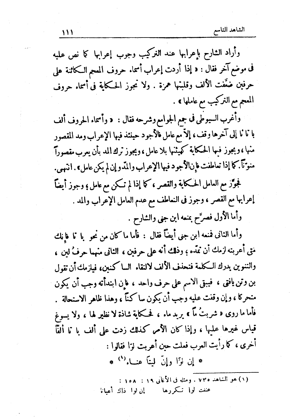 وَأَرَادَ الشَّارِح بإعرابها عِنْد التَّرْكِيب وجوب إعرابها كَمَا نَص عَلَيْهِ فِي مَوضِع آخر فَقَالَ إِذا أردْت إِعْرَاب أَسمَاء حُرُوف المعجم الكائنة على حرفين ضعفت الْألف وقلبتها همزَة وَلَا تجوز الْحِكَايَة فِي أَسمَاء حُرُوف المعجم مَعَ التَّرْكِيب مَعَ عاملها وَأغْرب السُّيُوطِيّ فِي جمع الْجَوَامِع وَشَرحه فَقَالَ وَأَسْمَاء الْحُرُوف ألف با تا ثا إِلَى آخرهَا وقف إِلَّا مَعَ عَامل فالأجود حِينَئِذٍ فِيهَا الْإِعْرَاب وَمد الْمَقْصُور مِنْهَا وَيجوز فِيهَا الْحِكَايَة كهيئتها بِلَا عَامل وَيجوز ترك الْمَدّ بِأَن يعرب مَقْصُورا منونا كَمَا إِذا تعاطفت فَإِن الأجود فِيهَا الْإِعْرَاب وَالْمدّ وَإِن لم يكن عَامل انْتهى فجوز مَعَ الْعَامِل الْحِكَايَة وَالْقصر كَمَا إِذا لم تكن مَعَ عَامل وَجوز أَيْضا إعرابها مَعَ الْقصر وَجوز فِي التعاطف مَعَ عدم الْعَامِل الْإِعْرَاب وَالْمدّ وَأما الأول فَصرحَ بِمَنْعه ابْن جني وَالشَّارِح وَأما الثَّانِي فَمَنعه ابْن جني أَيْضا فَقَالَ فَأَما مَا كَانَ من نَحْو با تا فَإنَّك مَتى أعربته لزمك أَن تمده وَذَلِكَ أَنه على حرفين الثَّانِي مِنْهُمَا حرف؟ لين والتنوين يدْرك الْكَلِمَة فتحذف الْألف لالتقاء الساكنين فيلزمك أَن تَقول بن وتن يَا فَتى فَيبقى الِاسْم على حرف وَاحِد فَإِن ابتدأته وَجب أَن يكون متحركا وَإِن وقفت عَلَيْهِ وَجب أَن يكون سَاكِنا وَهَذَا ظَاهر الاستحالة فَأَما مَا روى شربت مَا يُرِيد مَاء فحكاية شَاذَّة لَا نَظِير لَهَا وَلَا يسوغ قِيَاس غَيرهَا عَلَيْهَا وَإِذا كَانَ الْأَمر كَذَلِك زِدْت على ألف با تا ألفا أُخْرَى كَمَا رَأَيْت الْعَرَب فعلت حِين أعربت لوا فَقَالُوا (الْخَفِيف)