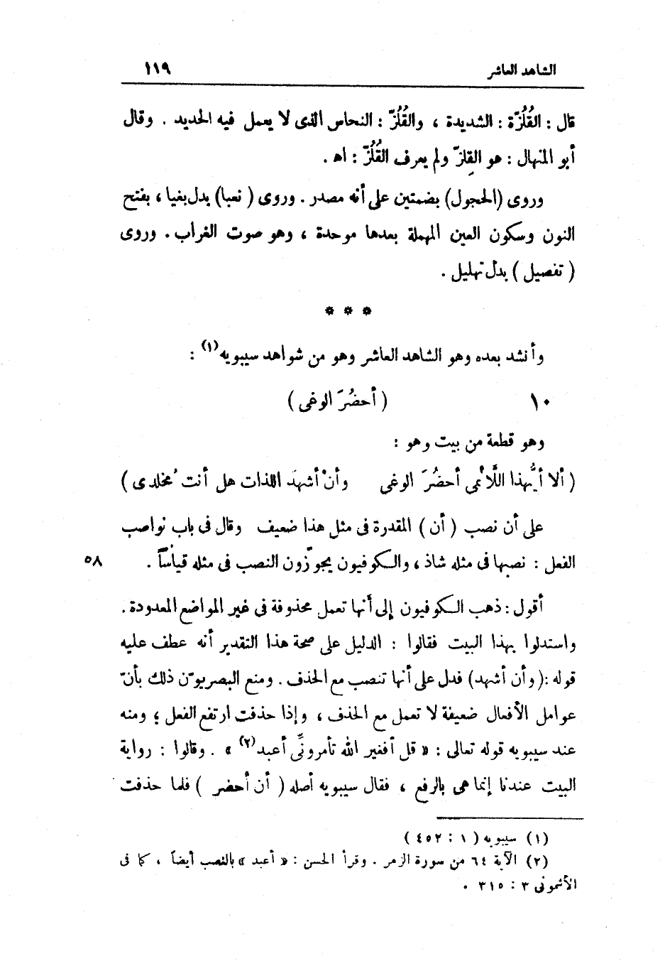 على ان نصب أَن الْمقدرَة فِي مثل هَذَا ضَعِيف وَقَالَ فِي بَاب نواصب الْفِعْل نصبها فِي مثله شَاذ والكوفيون يجوزون النصب فِي مثله قِيَاسا أَقُول ذهب الْكُوفِيُّونَ إِلَى أَنَّهَا تعْمل محذوفة فِي غير الْمَوَاضِع المعدودة وَاسْتَدَلُّوا بِهَذَا الْبَيْت فَقَالُوا الدَّلِيل على صِحَة هَذَا التَّقْدِير أَنه عطف عَلَيْهِ قَوْله (وَأَن أشهد) فَدلَّ على أَنَّهَا تنصب مَعَ الْحَذف وَمنع البصريون ذَلِك بِأَن عوامل الْأَفْعَال ضَعِيفَة لَا تعْمل مَعَ الْحَذف وَإِذا حذفت ارْتَفع الْفِعْل وَمِنْه عِنْد سِيبَوَيْهٍ قَوْله تَعَالَى {قل أفغير الله تأمروني أعبد} وَقَالُوا رِوَايَة الْبَيْت عندنَا إِنَّمَا هِيَ بِالرَّفْع فَقَالَ سِيبَوَيْهٍ أَصله أَن أحضر فَلَمَّا حذفت