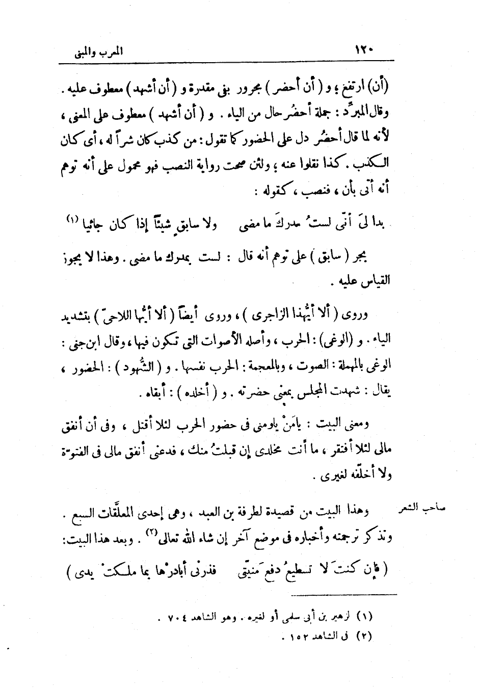 بجر سَابق على توهم أَنه قَالَ لست بمدرك مَا مضى وَهَذَا لَا يجوز الْقيَاس عَلَيْهِ وَرُوِيَ أَلا أيهذا الزاجري وَرُوِيَ أَيْضا أَلا أَيهَا اللاحي بتَشْديد الْيَاء والوغي الْحَرْب وَأَصله الْأَصْوَات الَّتِي تكون فِيهَا وَقَالَ ابْن جني الوغي بِالْمُهْمَلَةِ الصَّوْت وبالمعجمة الْحَرْب نَفسهَا وَالشُّهُود الْحُضُور يُقَال شهِدت الْمجْلس بِمَعْنى حَضرته وأخلده أبقاه وَمعنى الْبَيْت يَا من يلومني فِي حُضُور الْحَرْب لِئَلَّا أقتل وَفِي ان أنْفق مَالِي لِئَلَّا أفتقر مَا أَنْت مخلدي إِن قبلت مِنْك فَدَعْنِي أنْفق مَالِي فِي الفتوة وَلَا أخلفه لغيري وَهَذَا الْبَيْت من قصيدة لطرفة بن العَبْد وَهِي إِحْدَى المعلقات السَّبع وَنَذْكُر تَرْجَمته وأخباره فِي مَوضِع آخر إِن شَاءَ الله تَعَالَى وَبعد هَذَا الْبَيْت