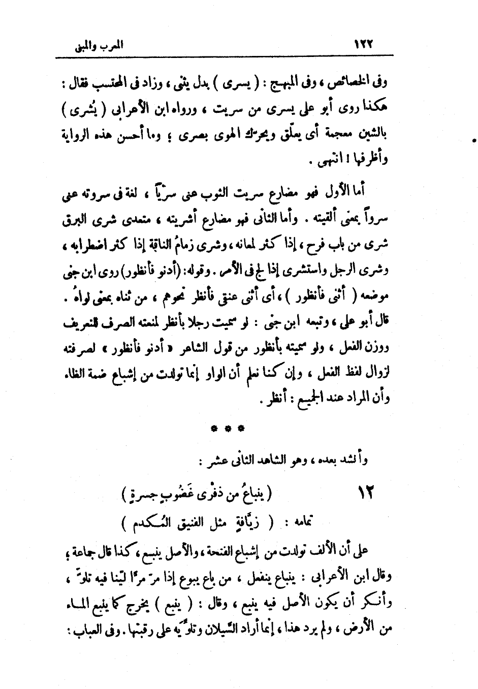 وَفِي الخصائص وَفِي الْمُبْهِج يسري بدل يثني وَزَاد فِي الْمُحْتَسب فَقَالَ هَكَذَا روى أَبُو عَليّ يسري من سريت وَرَوَاهُ ابْن الْأَعرَابِي يشري بالشين مُعْجمَة اي يعلق ويحرك الْهوى بَصرِي وَمَا أحسن هَذِه الرِّوَايَة وأظرفها انْتهى أما الأول فَهُوَ مضارع سريت الثَّوْب عني سريا لُغَة فِي سروته عني سروا بِمَعْنى أَلقيته وَأما الثَّانِي فَهُوَ مضارع أشريته متعدي شري الْبَرْق شرى من بَاب فَرح إِذا كثر لمعانه وشري زِمَام النَّاقة إِذا كثر اضطرابه وشرى الرجل واستشرى إِذا لج فِي الْأَمر وَقَوله (أدنو فأنظور) روى ابْن جني مَوْضِعه أثني فأنظور أَي أثني عنقِي فَأنْظر نحوهم من ثناه بِمَعْنى لواه قَالَ أَبُو عَليّ وَتَبعهُ ابْن جني لَو سميت