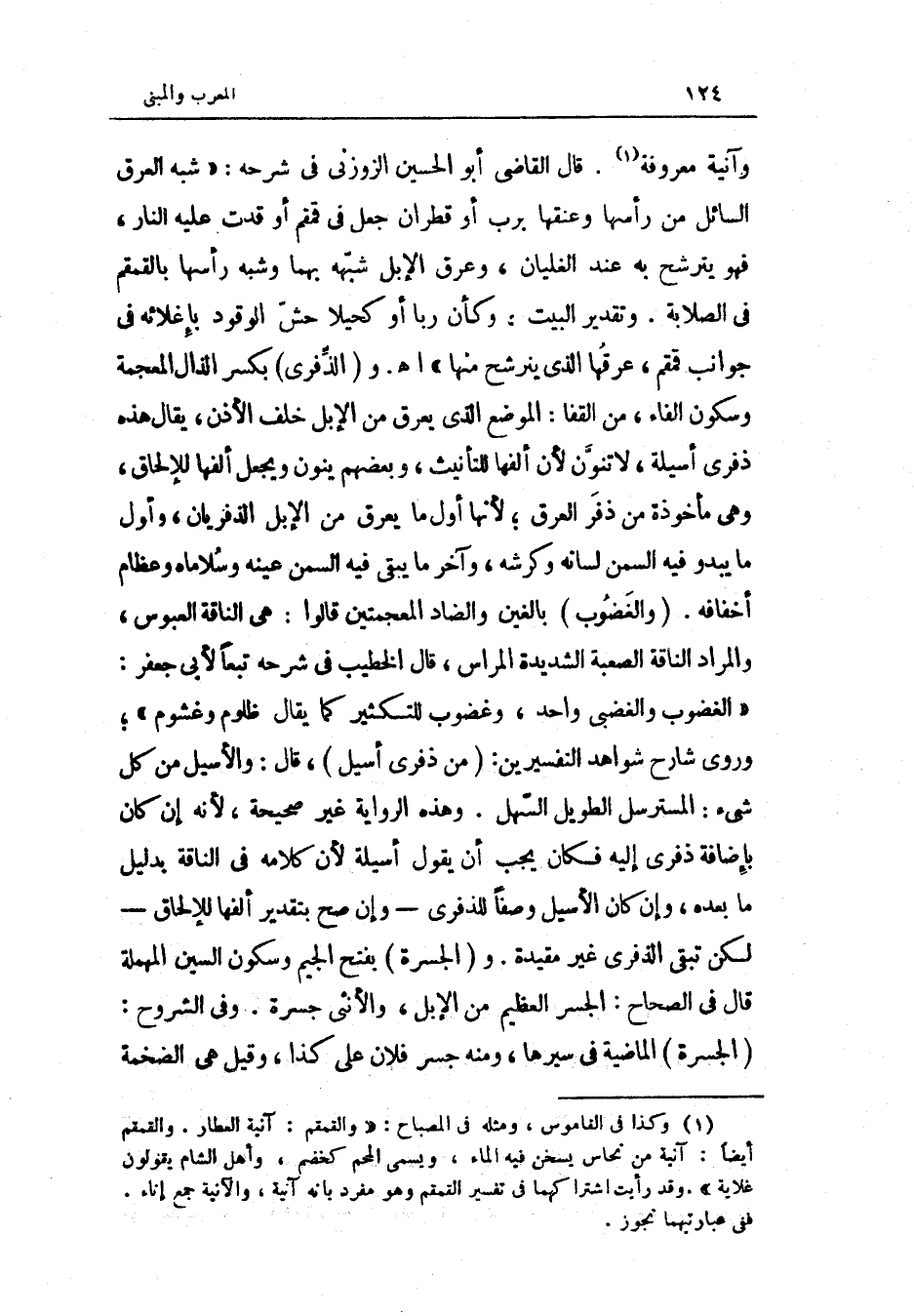 وآنية مَعْرُوفَة قَالَ القَاضِي أَبُو الْحُسَيْن الزوزني فِي شَرحه شبه الْعرق السَّائِل من رَأسهَا وعنقها بِرَبّ أَو قطران جعل فِي قمقم أوقدت عَلَيْهِ النَّار فَهُوَ يترشح بِهِ عِنْد الغليان وعرق الْإِبِل شبهه بهما وَشبه رَأسهَا بالقمقم فِي الصلابة وَتَقْدِير الْبَيْت وَكَأن رَبًّا أَو كحيلا حش الْوقُود بإغلائه فِي جَوَانِب قمقم عرقها الَّذِي ينرشح مِنْهَا ا. هـ.