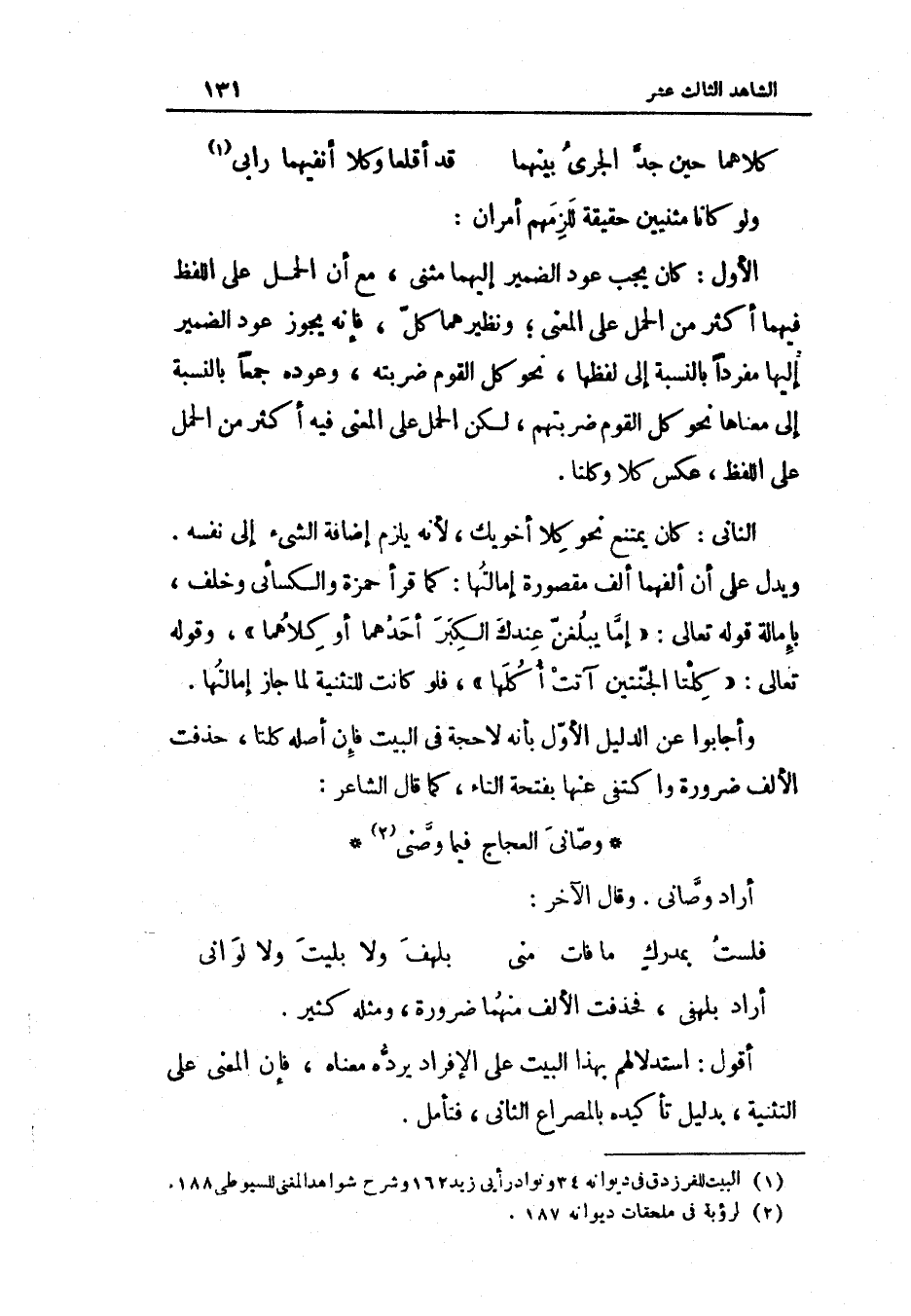الأول كَانَ يجب عود الضَّمِير إِلَيْهِمَا مثنى مَعَ أَن الْحمل على اللَّفْظ فيهمَا أَكثر من الْحمل على الْمَعْنى ونظيرهما كل فَإِنَّهُ يجوز عود الضَّمِير إِلَيْهَا مُفردا بِالنِّسْبَةِ إِلَى لَفظهَا نَحْو كل الْقَوْم ضَربته وَعوده جمعا بِالنِّسْبَةِ إِلَى مَعْنَاهَا نَحْو كل الْقَوْم ضربتهم لَكِن الْحمل على الْمَعْنى فِيهِ أَكثر من الْحمل على اللَّفْظ عكس كلا وكلتا الثَّانِي كَانَ يمْتَنع نَحْو كلا أخويك لِأَنَّهُ يلْزم إِضَافَة الشَّيْء إِلَى نَفسه وَيدل على أَن ألفهما ألف مَقْصُورَة إمالتها كَمَا قَرَأَ حَمْزَة وَالْكسَائِيّ وَخلف بإمالة قَوْله تَعَالَى {إِمَّا يبلغن عنْدك الْكبر أَحدهمَا أَو كِلَاهُمَا} وَقَوله تَعَالَى {كلتا الجنتين آتت أكلهَا} فَلَو كَانَت للتثنية لما جَازَ إمالتها