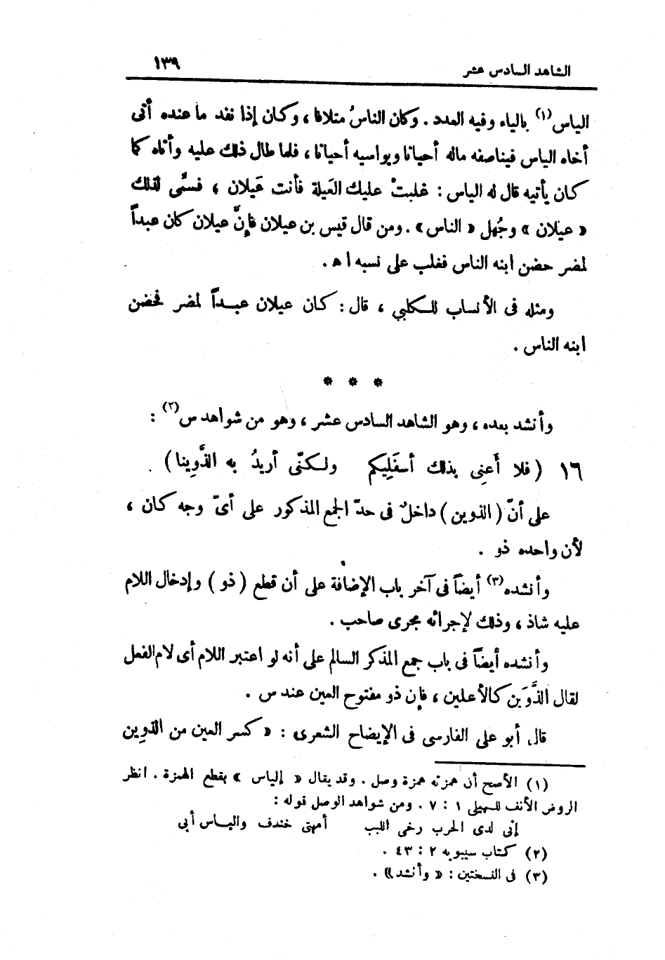 على أَن الذوين دَاخل فِي حد الْجمع الْمَذْكُور على أَي وَجه كَانَ لِأَن واحده ذُو وأنشده أَيْضا فِي آخر بَاب الْإِضَافَة على أَن قطع ذُو وَإِدْخَال اللَّام عَلَيْهِ شَاذ وَذَلِكَ لإجرائه مجْرى صَاحب وأنشده أَيْضا فِي بَاب الْجمع الْمُذكر السَّالِم على أَنه لَو اعْتبر اللَّام أَي لَام الْفِعْل لقَالَ الذوين كالأعلين فَإِن ذُو مَفْتُوح الْعين عِنْد س قَالَ أَبُو عَليّ الْفَارِسِي فِي الْإِيضَاح الشعري كسر الْعين من الذوين