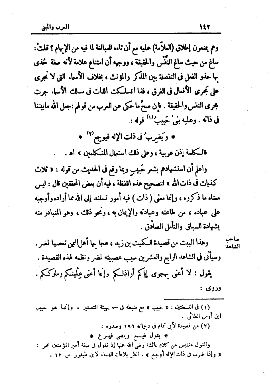 وَأعلم أَن استشهادهم بِشعر حبيب وَبِمَا وَقع فِي الحَدِيث من قَوْله ثَلَاث كذبات فِي ذَات الله لتصحيح هَذِه اللفظه فِيهِ أَن بعض الْمُحَقِّقين قَالَ لَيْسَ مَعْنَاهُ مَا ذَكرُوهُ وَإِنَّمَا معنى ذَات فِيهِ أُمُور تستند إِلَى الله مِمَّا أَرَادَهُ وأوجبه على عبَادَة من طَاعَته وعبادته وَالْإِيمَان بِهِ وَنَحْو ذَلِك وَهُوَ الْمُتَبَادر مِنْهُ بشهاده السِّيَاق والتأمل الصَّادِق وَهَذَا الْبَيْت من قصيدة الْكُمَيْت بن زيد هجا بهَا أهل الْيمن تعصبا لمضر وَسَيَأْتِي فِي الشَّاهِد الرَّابِع وَالْعِشْرين سَبَب عصبيته لمضر ونظمه لهَذِهِ القصيدة يَقُول لَا أعنى بهجوي إيَّاكُمْ أراذلكم وَإِنَّمَا أعنى عليتكم وملوككم وروى