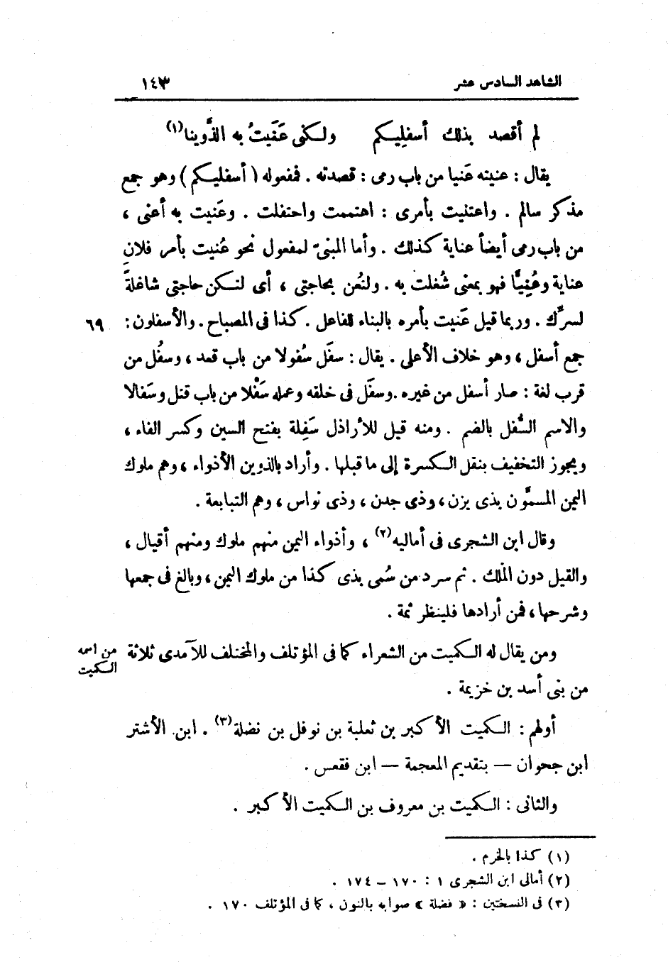 يُقَال عنيته عنيا من بَاب رمى قصدته فمفعوله أسفليكم وَهُوَ جمع مُذَكّر سَالم واعتنيت بأَمْري اهتممت واحتفلت وعنيت بِهِ أَعنِي من بَاب رمى أَيْضا عناية كَذَلِك وَأما الْمَبْنِيّ لمفعول نَحْو عنيت بِأَمْر فلَان عناية وعنيا فَهُوَ بِمَعْنى شغلت بِهِ ولتعن بحاجتي أَي لتكن حَاجَتي شاغلة لسرك وَرُبمَا قيل عنيت بأَمْره بِالْبِنَاءِ للْفَاعِل كَذَا فِي الْمِصْبَاح والأسفلون جمع أَسْفَل وَهُوَ خلاف الْأَعْلَى يُقَال سفل سفولا من بَاب قعد وسفل من بَاب قرب لُغَة صَار أَسْفَل من غَيره وسفل فِي خلقه وَعَمله سفلا من بَاب قتل وسفالا وَالِاسْم السّفل بِالضَّمِّ وَمِنْه قيل للأراذل سفلَة بِفَتْح السِّين وَكسر الْفَاء وَيجوز التَّخْفِيف بِنَقْل الكسرة إِلَى مَا قبلهَا وَأَرَادَ بالذوين الأذواء وهم مُلُوك الْيمن المسمون بِذِي يزن وَذي جدن وَذي نواس وهم التبابعة وَقَالَ ابْن الشجري فِي أمالية وأذواء الْيمن مِنْهُم مُلُوك وَمِنْهُم أقيال والقيل دون الْملك ثمَّ سرد من سمي بِذِي كَذَا من مُلُوك الْيمن وَبَالغ فِي جمعهَا وَشَرحهَا
