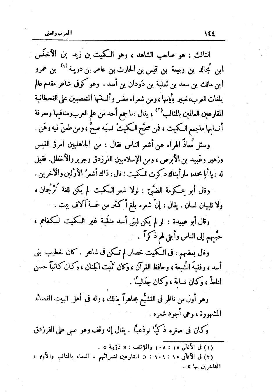 وَالثَّالِث هُوَ صَاحب الشَّاهِد وَهُوَ الْكُمَيْت بن زيد بن الْأَخْنَس بن مجَالد بن ربيعَة بن قيس بن الْحَارِث بن عَامر بن دويبة بن عَمْرو بن مَالك بن سعد بن ثَعْلَبَة ابْن دودان بن أَسد وَهُوَ كُوفِي شَاعِر مقدم عَالم بلغات الْعَرَب خَبِير بأيامها وَمن شعراء مُضر وألسنتها المتعصبين على القحطانية المقارعين الْعَالمين بالمثالب يُقَال مَا جمع أحد من علم الْعَرَب ومناقبها وَمَعْرِفَة أنسابها مَا جمع الْكُمَيْت فَم صحّح الْكُمَيْت نسبه صَحَّ وَمن طعن فِيهِ وَهن وَسُئِلَ معَاذ الهراء عَن أشعر النَّاس فَقَالَ من الجاهليين امْرُؤ الْقَيْس وَزُهَيْر وَعبيد ابْن الأبرص وَمن الإسلاميين الفرزدق وَجَرِير والأخطل فَقيل لَهُ يَا أَبَا مُحَمَّد مَا رَأَيْنَاك ذكرت الْكُمَيْت قَالَ ذَاك أشعر الْأَوَّلين والآخرين وَقَالَ أَبُو عِكْرِمَة الضَّبِّيّ لَوْلَا شعر الْكُمَيْت لم يكن للغة ترجمان وَلَا للْبَيَان لِسَان يُقَال إِن شعره بلغ أَكثر من خَمْسَة آلَاف بَيت وَقَالَ أَبُو عُبَيْدَة لَو لم يكن لبني أَسد منقبة غير الْكُمَيْت لكفاهم حببهم إِلَى النَّاس وَأبقى لَهُم ذكرا وَقَالَ بَعضهم فِي الْكُمَيْت خِصَال لم تكن فِي شَاعِر كَانَ خطيب بني أَسد