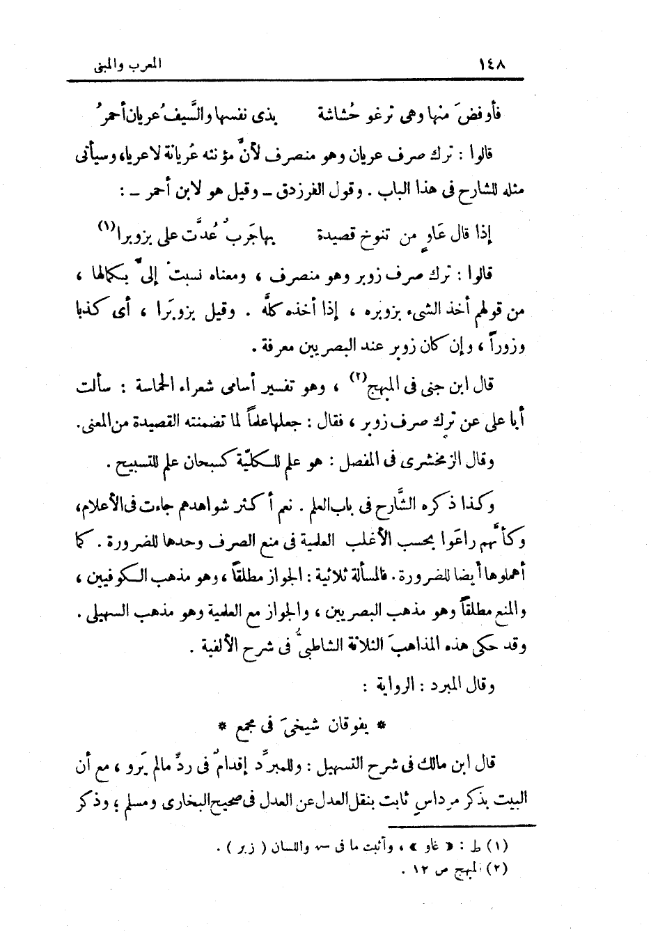 قَالُوا ترك صرف زوبر وَهُوَ منصرف وَمَعْنَاهُ نسبت إِلَيّ بكمالها من قَوْلهم أَخذ الشَّيْء بزوبره إِذا أَخذه كُله وَقيل بزوبرا أَي كذبا وزورا وَإِن كَانَ زوبر عِنْد الْبَصرِيين معرفَة قَالَ ابْن جني فِي الْمُبْهِج وَهُوَ تَفْسِير أسامي شعراء الحماسة سَأَلت أَبَا عَليّ عَن ترك صرف زوبر فَقَالَ جعلهَا علما لما تضمنته القصيدة من الْمَعْنى وَقَالَ الزَّمَخْشَرِيّ فِي الْمفصل هُوَ علم للكلية كسبحان علم للتسبيح وَكَذَا ذكره الشَّارِح فِي بَاب الْعلم نعم أَكثر شواهدهم جَاءَت فِي الْأَعْلَام وَكَأَنَّهُم راعوا بِحَسب الْأَغْلَب العلمية فِي منع الصرغ وَحدهَا للضَّرُورَة كَمَا أهملوها أَيْضا للضَّرُورَة فَالْمَسْأَلَة ثلاثية الْجَوَاز مُطلقًا وَهُوَ مَذْهَب الْكُوفِيّين وَالْمَنْع مُطلقًا وَهُوَ مَذْهَب الْبَصرِيين وَالْجَوَاز مَعَ العلمية وَهُوَ مَذْهَب السُّهيْلي وَقد حكى هَذِه الْمذَاهب الثَّلَاثَة الشاطبي فِي شرح الألفية وَقَالَ الْمبرد الرِّوَايَة