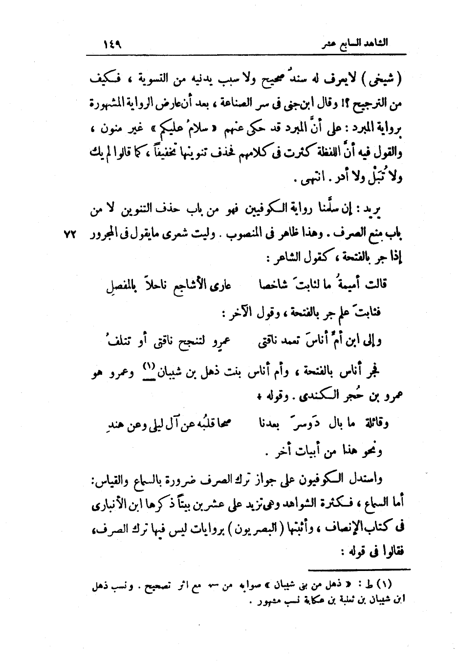 السماع فكثرة الشواهد وَهِي تزيد على عشْرين بَيْتا ذكرهَا ابْن الْأَنْبَارِي فِي كتاب الْإِنْصَاف واثبتها البصريون بروايات لَيْسَ فِيهَا ترك الصّرْف فَقَالُوا فِي قَوْله ...