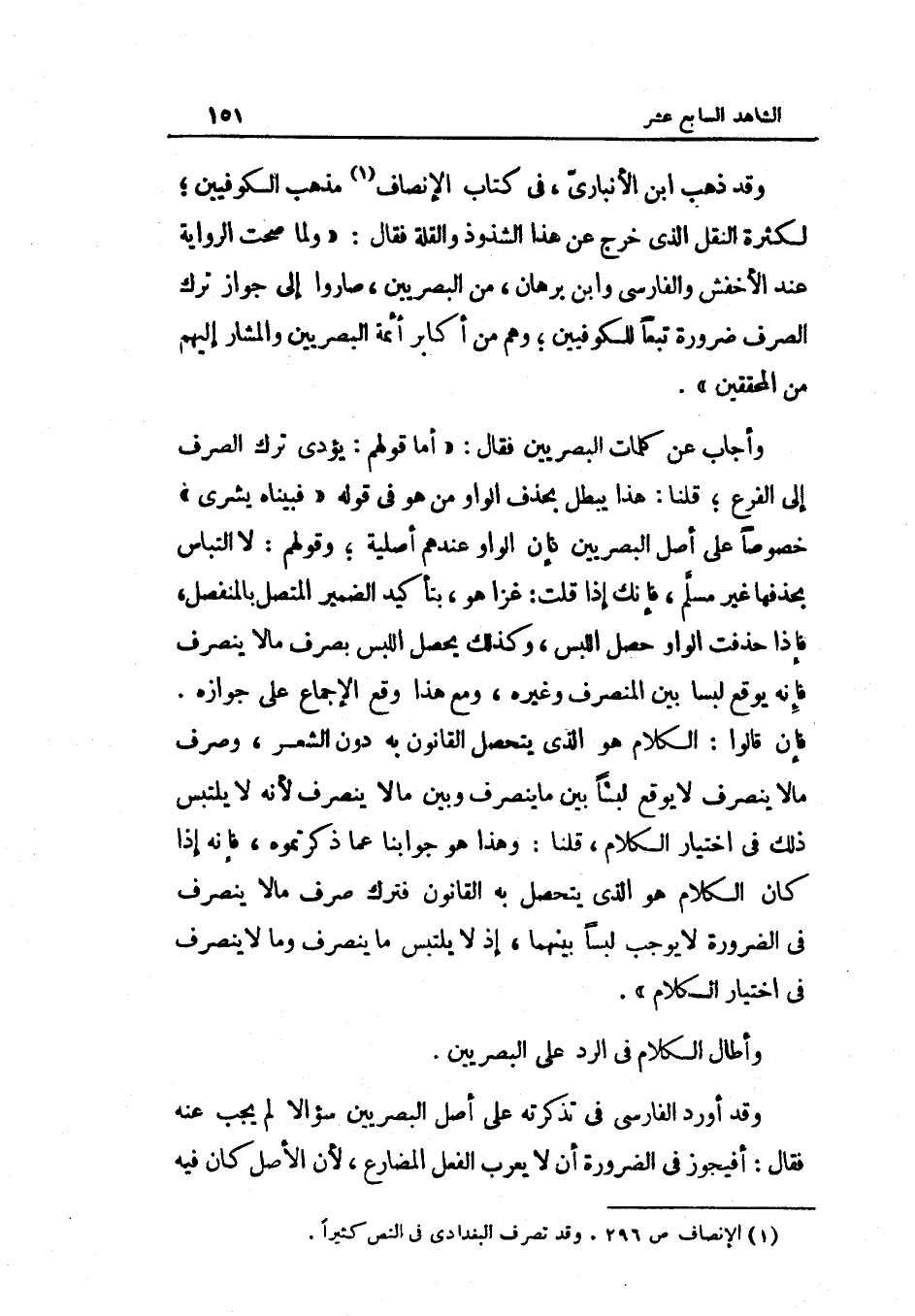 وَقد ذهب ابْن الْأَنْبَارِي فِي كتاب الْإِنْصَاف مَذْهَب الْكُوفِيّين لِكَثْرَة النَّقْل الَّذِي خرج عَن هَذَا الشذوذ والقلة فَقَالَ وَلما صحت الرِّوَايَة عِنْد الْأَخْفَش والفارسي وَابْن برهَان من الْبَصرِيين صَارُوا إِلَى جَوَاز ترك الصّرْف ضَرُورَة تبعا للكوفيين وهم من أكَابِر أَئِمَّة الْبَصرِيين والمشار إِلَيْهِم من الْمُحَقِّقين وَأجَاب عَن كَلِمَات الْبَصرِيين فَقَالَ أما قَوْلهم يُؤَدِّي ترك الصّرْف إِلَى الْفَرْع قُلْنَا هَذَا يبطل بِحَذْف الْوَاو من هُوَ فِي قَوْله فبيناه يشري خُصُوصا على أصل الْبَصرِيين فَإِن الْوَاو عِنْدهم أَصْلِيَّة وَقَوْلهمْ لَا التباس بحذفها غير مُسلم فَإنَّك إِذا قلت غزا هُوَ بتأكيد الضَّمِير الْمُتَّصِل بالمنفصل فَإِذا حذفت الْوَاو حصل اللّبْس وَكَذَلِكَ يحصل اللّبْس بِصَرْف مَا لَا ينْصَرف فَإِنَّهُ يُوقع لبسا بَين المنصرف وَغَيره وَمَعَ هَذَا وَقع الْإِجْمَاع على جَوَازه فَإِن قَالُوا الْكَلَام هُوَ الَّذِي يتَحَصَّل القانون بِهِ دون الشّعْر وَصرف مَا لَا ينْصَرف لَا يُوقع لبسا بَين مَا ينْصَرف وَبَين مَا لَا ينْصَرف لِأَنَّهُ لَا يلتبس ذَلِك فِي أختيار الْكَلَام قُلْنَا وَهَذَا هُوَ جَوَابنَا عَمَّا ذكرتموه فَإِنَّهُ إِذا كَانَ الْكَلَام هُوَ الَّذِي يتَحَصَّل بِهِ القانون فَترك صرف مَا لَا ينْصَرف فِي الضَّرُورَة لَا يُوجب لبسا بَينهمَا إِذْ لَا يلتبس مَا ينْصَرف وَمَا لَا ينْصَرف فِي اخْتِيَار الْكَلَام وَأطَال الْكَلَام فِي الرَّد على الْبَصرِيين وَقد أورد الْفَارِسِي فِي تَذكرته على أصل الْبَصرِيين سؤالا لم يجب عَنهُ فَقَالَ أفيجوز فِي الضَّرُورَة أَن لَا يعرب الْفِعْل الْمُضَارع لِأَن الأَصْل كَانَ فِيهِ