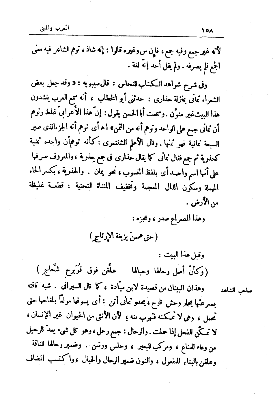 لِأَنَّهُ غير جمع وَفِيه جمع فَإِن س وَغَيره قَالُوا إِنَّه شَاذ توهم الشَّاعِر فِيهِ معنى الْجمع فَلم يصرفهُ وَلم يقل أحد إِنَّه لُغَة وَفِي شرح شَوَاهِد الْكتاب للنحاس قَالَ سِيبَوَيْهٍ وَقد جعل بعض الشُّعَرَاء ثَمَانِي بِمَنْزِلَة حذَارِي حَدثنِي أَبُو الْخطاب أَنه سمع الْعَرَب ينشدون هَذَا الْبَيْت غير منون وَسمعت أَبَا الْحسن يَقُول إِن هَذَا الْأَعرَابِي غلط وتوهم أَن ثَمَانِي جمع على الْوَاحِد وتوهم أَنه من الثّمن ا. هـ.