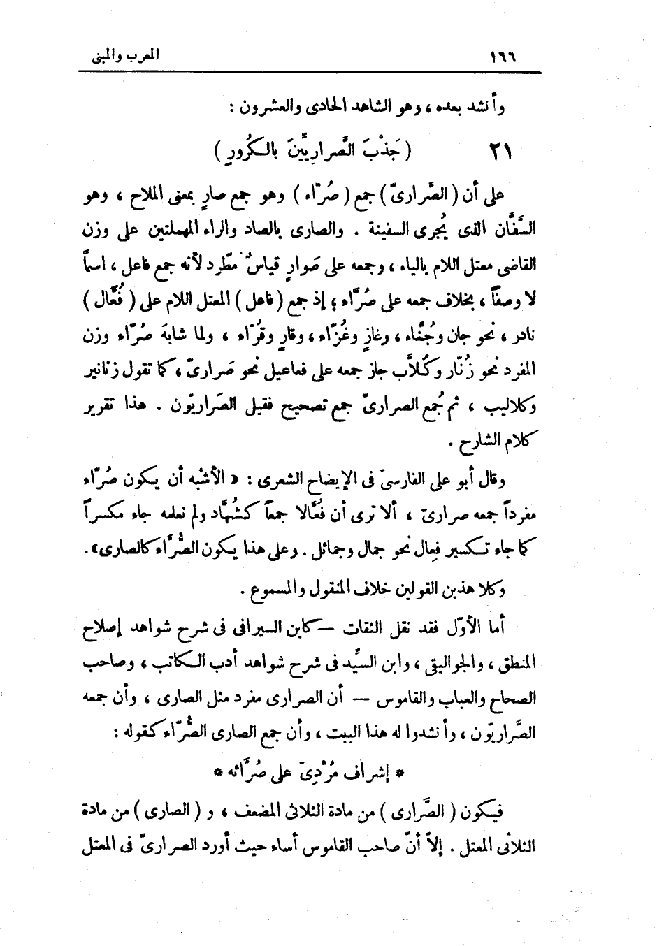 وَأنْشد بعده وَهُوَ الشَّاهِد الْحَادِي وَالْعشْرُونَ (الرجز جذب الصواريين بالكرور) على أَن الصراري جمع صراء وَهُوَ جمع صَار بِمَعْنى الملاح وَهُوَ السفان الَّذِي يجْرِي السَّفِينَة والصاري بالصَّاد وَالرَّاء الْمُهْمَلَتَيْنِ على وزن القَاضِي معتل اللَّام بِالْيَاءِ وَجمعه على صوار قِيَاس مطرد لِأَنَّهُ جمع فَاعل اسْما لَا وَصفا بِخِلَاف جمعه على صراء إِذْ جمع فَاعل المعتل اللَّام على فعال نَادِر نَحْو جَان وجناء وغاز وغزاء وقار وقراء وَلما شابه صراء وزن الْمُفْرد نَحْو زنار وكلاب جَازَ جمعه على فعاعيل نَحْو صراري كَمَا تَقول زنانير وكلاليب ثمَّ جمع الصراري جمع تَصْحِيح فَقيل الصراريون هَذَا تَقْرِير كَلَام الشَّارِح وَقَالَ أَبُو عَليّ الْفَارِسِي فِي الْإِيضَاح الشعري الْأَشْبَه أَن يكون صراء مُفردا جمعه صراري أَلا ترى أَن فعالا جمعا كشهاد وَلم نعلمهُ جَاءَ مكسرا كَمَا جَاءَ تكسير فعال نَحْو جمال وجمائل وعَلى هَذَا يكون الصراء كالصارى وكلا هذَيْن الْقَوْلَيْنِ خلاف الْمَنْقُول والمسموع أما الأول فقد نقل الثِّقَات كَابْن السيرافي فِي شرح شَوَاهِد إصْلَاح الْمنطق والجواليقي وَابْن السَّيِّد فِي شرح شَوَاهِد أدب الْكَاتِب وَصَاحب الصِّحَاح والعباب والقاموس أَن الصراري مُفْرد مثل الصاري وَأَن جمعه الصراريون وأنشدوا لَهُ هَذَا الْبَيْت وَأَن جمع الصاري الصراء كَقَوْلِه