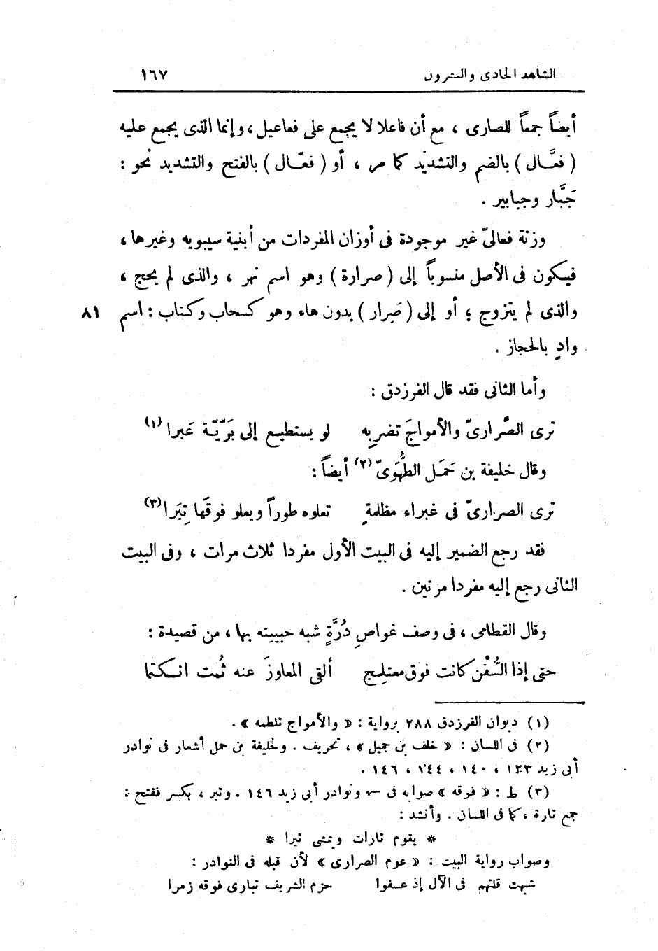أَيْضا جمعا للصاري مَعَ أَن فَاعِلا لَا يجمع على فعاعيل وَإِنَّمَا الَّذِي يجمع عَلَيْهِ فعال بِالضَّمِّ وَالتَّشْدِيد كَمَا مر أَو فعال بِالْفَتْح وَالتَّشْدِيد نَحْو جَبَّار وجبابير وَزنه فعالي غير مَوْجُودَة فِي أوزان الْمُفْردَات من أبنية سِيبَوَيْهٍ وَغَيرهَا فَيكون فِي الأَصْل مَنْسُوبا إِلَى صرارة وَهُوَ اسْم نهر وَالَّذِي لم يحجّ وَالَّذِي لم يتَزَوَّج أَو إِلَى صرار بِدُونِ هَاء وَهُوَ كسحاب وَكتاب اسْم وَاد بالحجاز وَأما الثَّانِي فقد قَالَ الفرزدق البسبيط)