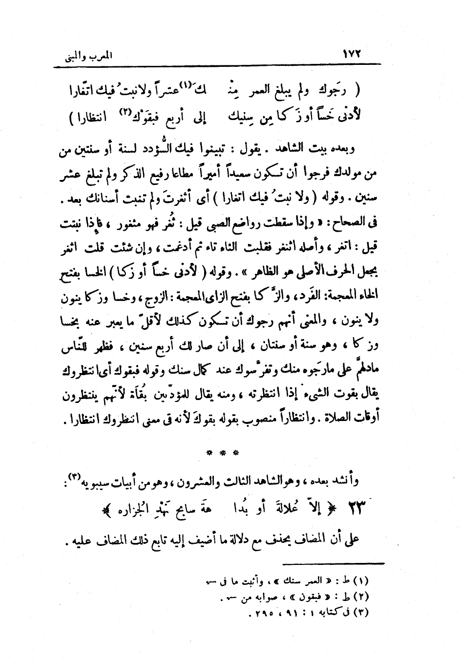 وَبعده بَيت الشَّاهِد يَقُول تبينوا فِيك السؤدد لسنة أَو سنتَيْن من مولدك فَرجوا أَن تكون سعيدا أَمِيرا مُطَاعًا رفيع الذّكر وَلم تبلغ عشْرين سنة وَقَوله وَلَا نبت فِيك أتغارا أَي أثغرت وَلم تنْبت أسنانك بعد فِي الصِّحَاح وَإِذا سَقَطت رواضع الصَّبِي قيل ثغر فَهُوَ مثغور فَإِذا نَبتَت قيل اتغر وَأَصله اثتغر فقلبت الثَّاء تَاء ثمَّ أدغمت وَإِن شِئْت قلت اثغر يَجْعَل الْحَرْف الأصلى هُوَ الظَّاهِر وَقَوله لأدنى خسا أَو زكا الخسا بِفَتْح الْخَاء الْمُعْجَمَة الْفَرد والزكا