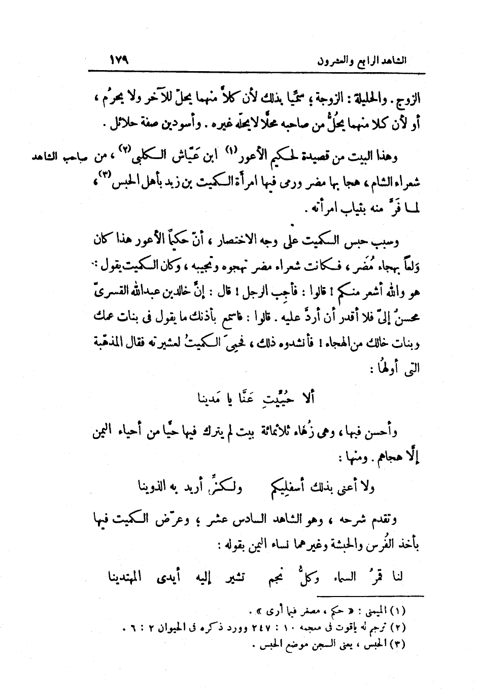 الزَّوْج والحليلة الزَّوْجَة سميا بذلك لِأَن كلا مِنْهُمَا يحل للأخر وَلَا يحرم أَو لِأَن كلا مِنْهُمَا يحل من صَاحبه محلا لَا يحله غَيره وأسودين صفة حلائل وَهَذَا الْبَيْت من قصيدة لحكيم الْأَعْوَر ابْن عَيَّاش الْكَلْبِيّ من شعراء الشَّام هجا بهَا مُضر وَرمى فِيهَا أمْرَأَة الْكُمَيْت بن زيد بِأَهْل الْحَبْس لما فر مِنْهُ بِثِيَاب امْرَأَته