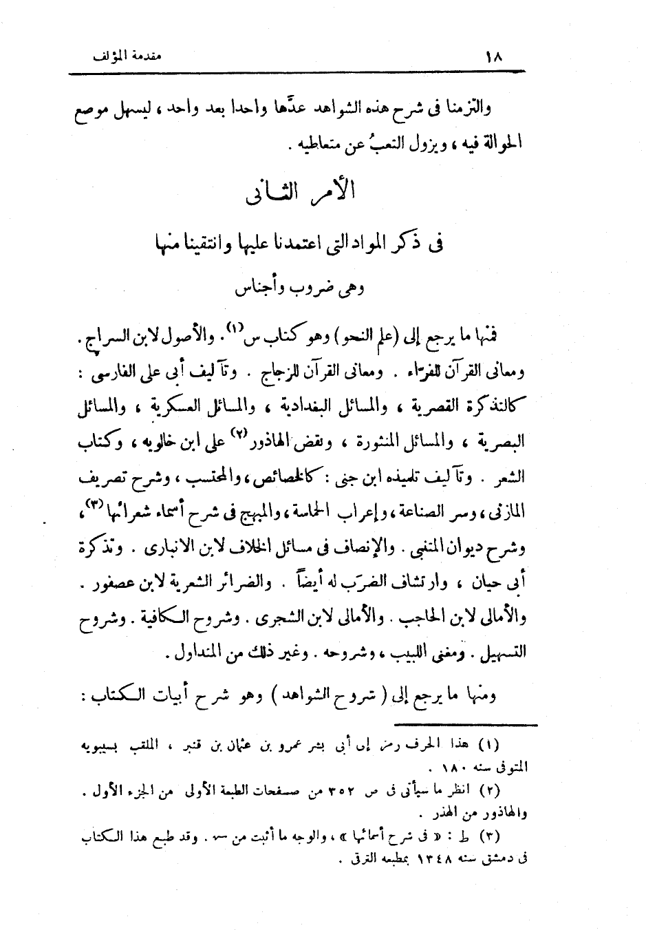 فَمِنْهَا مَا يرجع إِلَى علم النَّحْو وَهُوَ كتاب س وَالْأُصُول لِأَبْنِ السراج ومعاني الْقُرْآن للفراء ومعاني الْقُرْآن للزجاج وتأليف أبي عَليّ الْفَارِسِي ك التَّذْكِرَة القصرية والمسائل البغدادية والمسائل العسكرية والمسائل البصرية والمسائل المنثورة وَنقض الهاذور على ابْن خالويه وَكتاب الشّعْر وتأليف تِلْمِيذه ابْن جني ك الخصائص والمحتسب وَشرح تصريف الْمَازِني وسر الصِّنَاعَة وإعراب الحماسة والمبهج فِي شرح أَسمَاء شعرائها وَشرح ديوَان المتنبي والإنصاف فِي مسَائِل الْخلاف لِابْنِ الْأَنْبَارِي وتذكره أبي حَيَّان وارتشاف الضَّرْب لَهُ أَيْضا والضرائر الشعرية لِابْنِ عُصْفُور والأمالي لِابْنِ الْحَاجِب والأمالي لِأَبْنِ الشجري وشروح الكافية وشروح التسهيل ومغنى اللبيب وشروحه وَغير ذَلِك من المتداول وَمِنْهَا مَا يرجع إِلَى شُرُوح الشواهد وَهُوَ شرح أَبْيَات الْكتاب