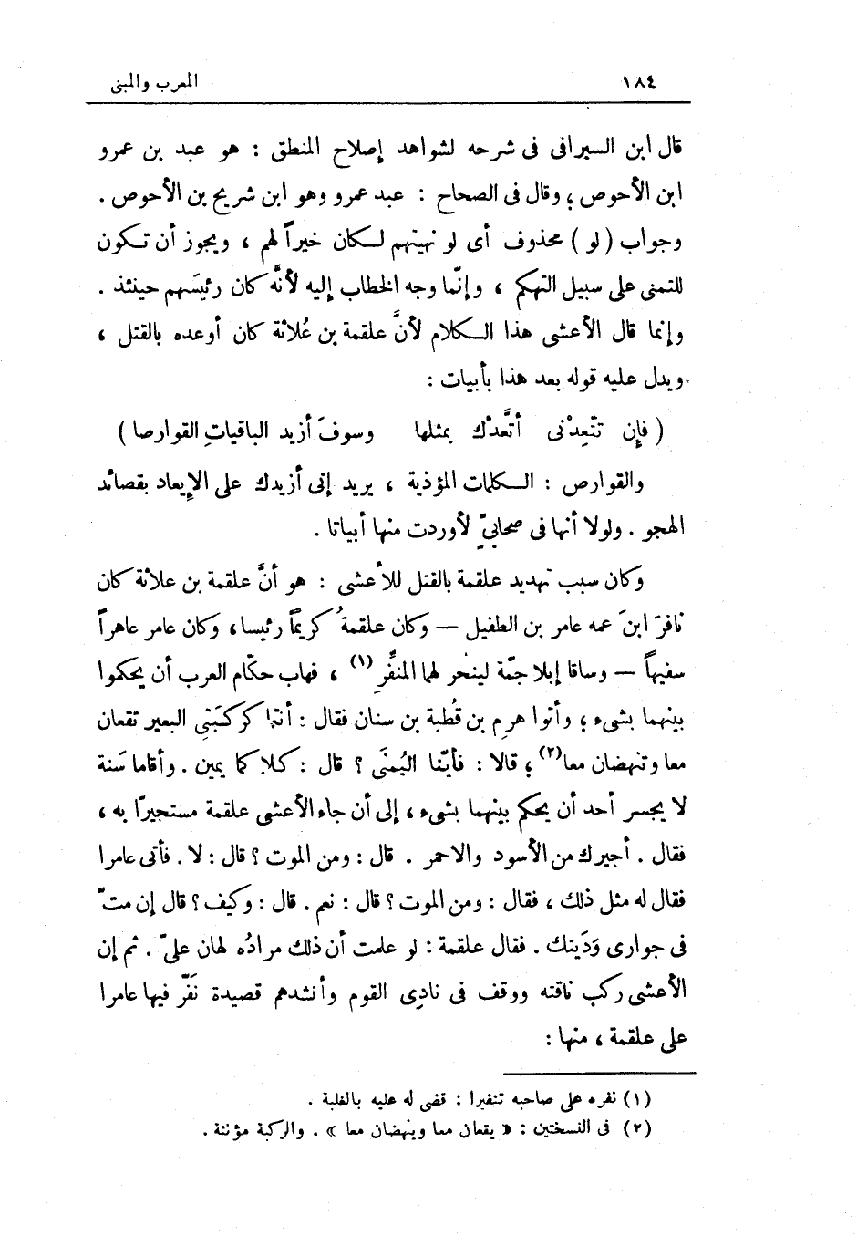 والقوارص الْكَلِمَات المؤذية يُرِيد إِنِّي أزيدك على الإيعاد بقصائد الهجو وَلَوْلَا أَنَّهَا فِي صَحَابِيّ لأوردت مِنْهَا أبياتا وَكَانَ سَبَب تهديد عَلْقَمَة بِالْقَتْلِ للأعشى هُوَ أَن عَلْقَمَة بن علاثة كَانَ نافر ابْن عَمه عَامر بن الطُّفَيْل وَكَانَ عَلْقَمَة كَرِيمًا رَئِيسا وَكَانَ عَامر عاهرا سَفِيها وساقا إبِلا جمة لينحر لَهما المنفر فهاب حكام الْعَرَب أَن يحكموا بَينهمَا بِشَيْء وَأتوا هرم بن قُطْبَة بن سِنَان فَقَالَ أَنْتُمَا كركبتي الْبَعِير تقعان مَعًا وتنهضان مَعًا قَالَا فأينا الْيُمْنَى قَالَ كلاكما يَمِين وَأَقَامَا سنة لَا يَجْسُر أحد أَن يحكم بَينهمَا بِشَيْء إِلَى أَن جَاءَ الْأَعْشَى عَلْقَمَة مستجيرا بِهِ فَقَالَ أجيرك من الْأسود والأحمر قَالَ وَمن الْمَوْت قَالَ لَا فَأتى عَامِرًا فَقَالَ لَهُ مثل ذَلِك فَقَالَ وَمن الْمَوْت قَالَ نعم قَالَ وَكَيف قَالَ إِن مت فِي جواري وديتك فَقَالَ عَلْقَمَة لَو علمت أَن ذَلِك مُرَاده لهان عَليّ ثمَّ إِن الْأَعْشَى ركب نَاقَته ووقف فِي نَادَى الْقَوْم وانشدهم قصيدة نفر فِيهَا عَامِرًا على عَلْقَمَة مِنْهَا