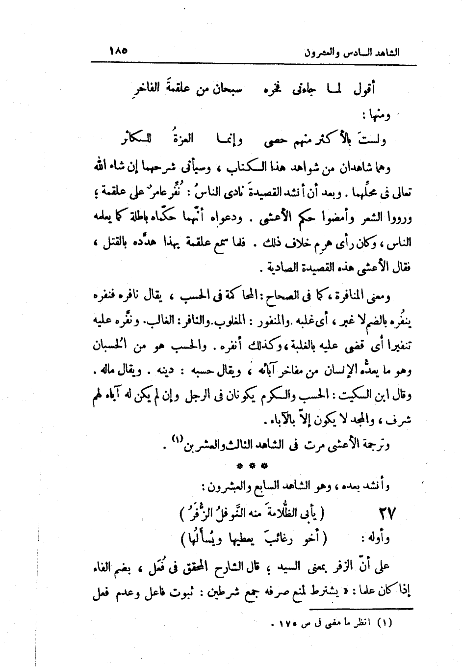 وهما شَاهِدَانِ من شَوَاهِد هَذَا الْكتاب وَسَيَأْتِي شرحهما إِن شَاءَ الله تَعَالَى فِي مَحلهمَا وَبعد أَن أنْشد القصيدة نَادَى النَّاس نفر عَامر على عَلْقَمَة وَرووا الشّعْر وأمضوا حكم الْأَعْشَى ودعواه أَنَّهُمَا حكماه بَاطِلَة كَمَا يُعلمهُ النَّاس وَكَانَ رَأْي هرم خلاف ذَلِك فَلَمَّا سمع عَلْقَمَة بِهَذَا هدده بِالْقَتْلِ فَقَالَ الْأَعْشَى هَذِه القصيدة الصادية وَمعنى المنافرة كَمَا فِي الصِّحَاح المحاكمة فِي الْحسب يُقَال نافرة فنفره ينفره بِالضَّمِّ لَا غير أَي غَلبه والمنفور المغلوب والنافر الْغَالِب ونفره عَلَيْهِ تنفيرا أَي قضى عَلَيْهِ بالغلبة وَكَذَلِكَ أنفره والحسب هُوَ من الحسبان وَهُوَ مَا يعده الْإِنْسَان من مفاخر آبَائِهِ وَيُقَال حَسبه دينه وَيُقَال مَاله وَقَالَ ابْن السّكيت الْحسب وَالْكَرم يكونَانِ فِي الرجل وَإِن لم يكن لَهُ آبَاء لَهُم شرف وَالْمجد لَا يكون إِلَّا بِالْآبَاءِ وترجمة الْأَعْشَى مرت فِي الشَّاهِد الثَّالِث وَالْعِشْرين وَأنْشد بعده وَهُوَ الشَّاهِد السَّابِع وَالْعشْرُونَ (الْبَسِيط)