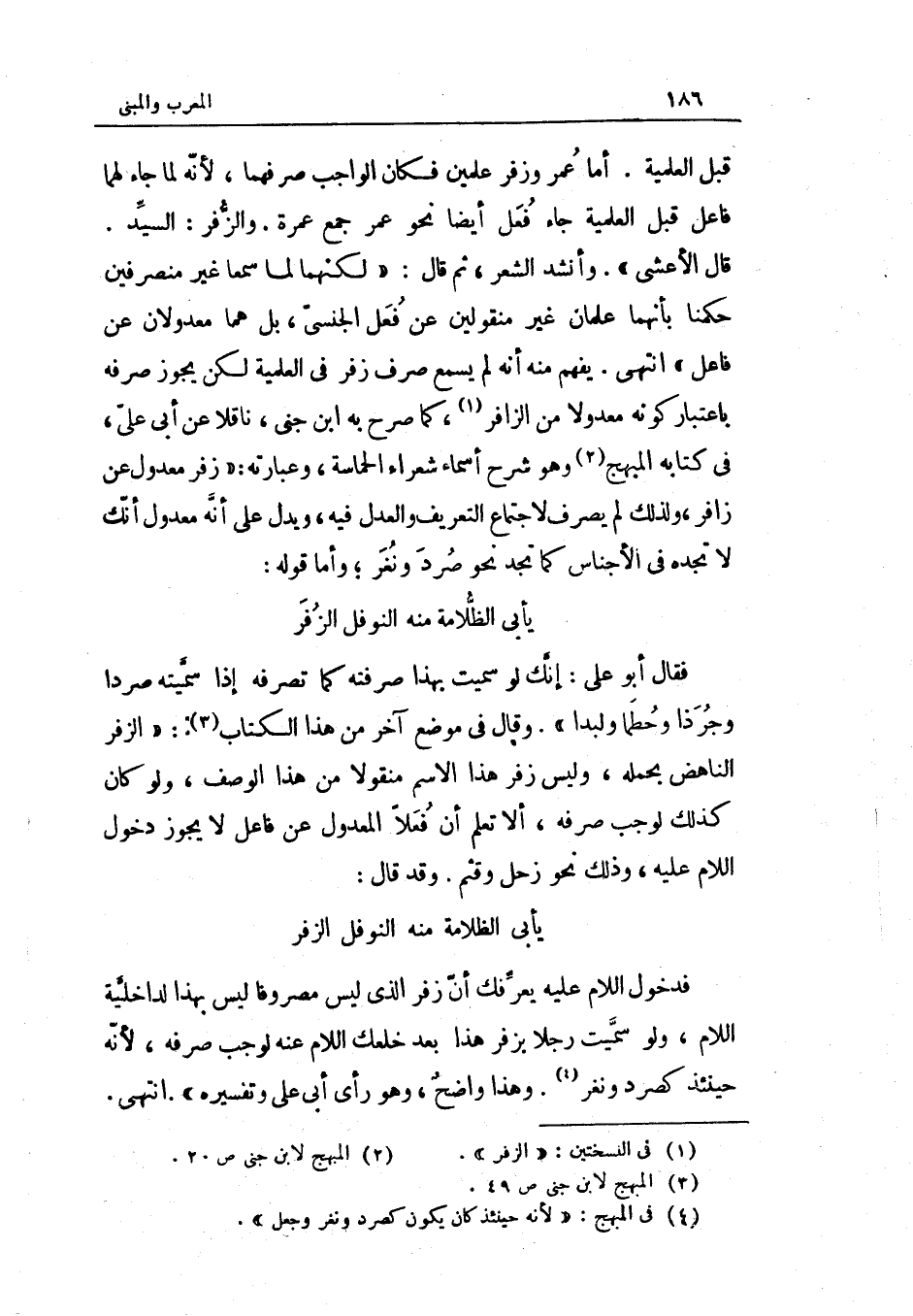 ثمَّ قَالَ لكنهما لما سمعا غير منصرفين حكمنَا بِأَنَّهُمَا علمَان غير منقولين عَن فعل الجنسي بل هما معدولان عَن فَاعل انْتهى يفهم مِنْهُ أَنه لم يسمع صرف زفر فِي العلمية لَكِن يجوز صرفه بِاعْتِبَار كَونه معدولا من الزافر كَمَا صرح بِهِ ابْن جني نَاقِلا عَن أبي عَليّ فِي كِتَابه الْمُبْهِج وَهُوَ شرح أَسمَاء شعراء الحماسة وَعبارَته زفر معدول عَن زَافِر وَلذَلِك لم يصرف لِاجْتِمَاع التَّعْرِيف وَالْعدْل فِيهِ وَيدل على أَنه معدول أَنَّك لَا تَجدهُ فِي الْأَجْنَاس كَمَا تَجِد صرد ونغر وَأما قَوْله