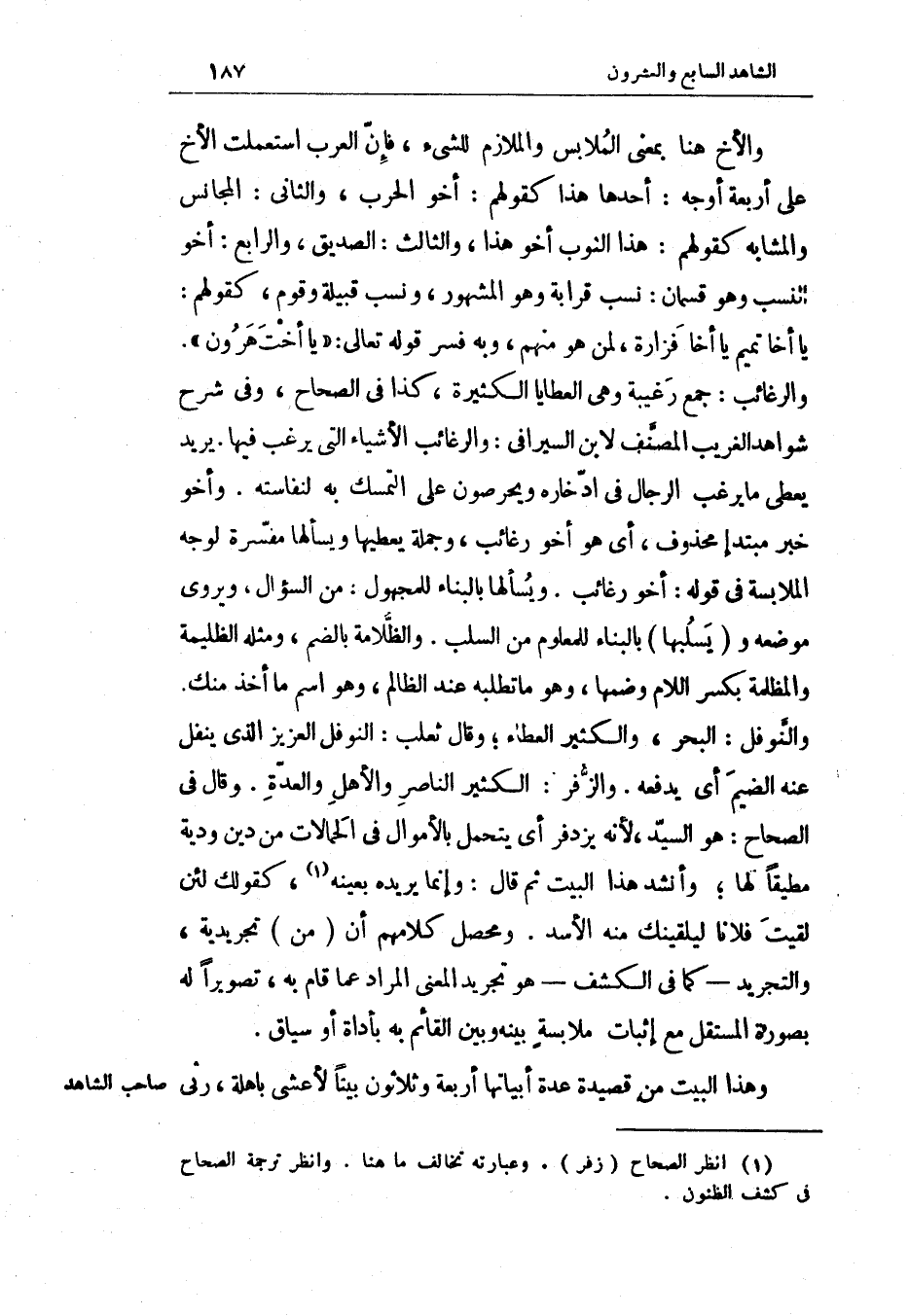 وَالْأَخ هُنَا بِمَعْنى الملابس والملازم للشَّيْء فَإِن الْعَرَب اسْتعْملت الْأَخ على أَرْبَعَة أوجه أَحدهَا هَذَا كَقَوْلِهِم أَخُو الْحَرْب وَالثَّانِي الْمجَالِس والمشابة كَقَوْلِهِم هَذَا الثَّوْب آخو هَذَا وَالثَّالِث الصّديق وَالرَّابِع أَخُو النّسَب وَهُوَ قِسْمَانِ نسب قرَابَة وَهُوَ الْمَشْهُور وَنسب قَبيلَة وَقوم كَقَوْلِهِم يَا أَخا تَمِيم يَا أَخا فَزَارَة لمن هُوَ مِنْهُم وَبِه فسر قَوْله تَعَالَى (يَا أُخْت هرون) والرغائب جمع