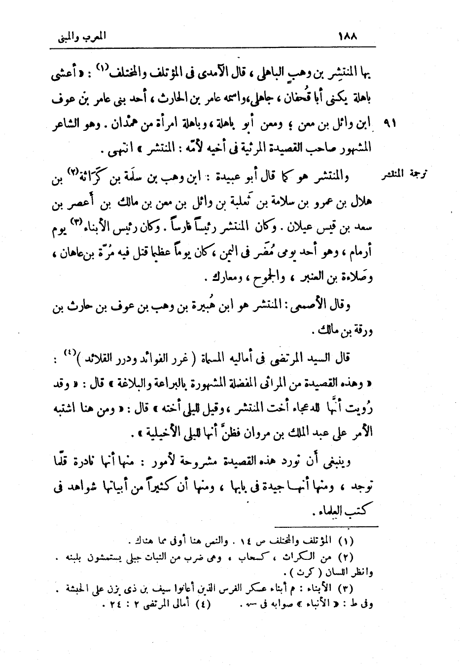 بهَا الْمُنْتَشِر بن وهب الْبَاهِلِيّ قَالَ الْآمِدِيّ فِي المؤتلف والمختلف اعشى باهلة يكنى أَبَا قحطان جاهلي واسْمه عَامر بن الْحَارِث أحد بني عَامر بن عَوْف بن وَائِل ابْن معن ومعن أَبُو باهلة وباهلة امْرَأَة من هَمدَان وَهُوَ الشَّاعِر الْمَشْهُور صَاحب القصيدة المرثية فِي أخية لأمة الْمُنْتَشِر انْتهى والمنتشر هُوَ كَمَا قَالَ أَبُو عُبَيْدَة ابْن وهب بن سَلمَة بن كراثة بن هِلَال ابْن عَمْرو بن سَلامَة بن ثَعْلَبَة بن وَائِل بن معن بن مَالك بن أعصر بن سعد بن قيس عيلان وَكَانَ الْمُنْتَشِر رَئِيسا فَارِسًا وَكَانَ رَئِيس الْأَبْنَاء يَوْم أرمام وَهُوَ أحد