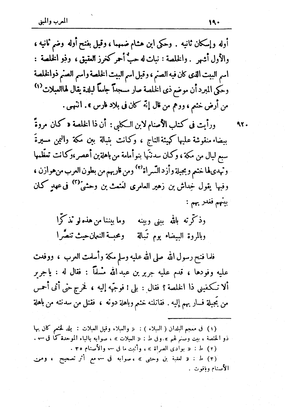 أَوله وَإِسْكَان ثَانِيَة وَحكى ابْن هِشَام ضمهما وَقيل بِفَتْح أَوله وَضم ثَانِيَة وَالْأول أشهر والخلصة نَبَات لَهُ حب أَحْمَر كخرز العقيق وَذُو الخلصة اسْم الْبَيْت الَّذِي كَانَ فِيهِ الصَّنَم وَقيل اسْم الْبَيْت الخلصة وَاسم الصَّنَم ذُو الخلصة وَحكى الْمبرد أَن مَوضِع ذِي الخلصة صَار مَسْجِدا جَامعا لبلدة يُقَال لَهَا العبلات من أَرض خثعم وَوهم من قَالَ إِنَّه كَانَ فِي بِلَاد فَارس انْتهى وَرَأَيْت فِي كتاب الْأَصْنَام لِابْنِ الْكَلْبِيّ أَن ذَا الخلصة كَانَ مروة بَيْضَاء منقوشة عَلَيْهَا كَهَيئَةِ التَّاج وَكَانَت بتبالة بَين مَكَّة واليمن مسيرَة سبع لَيَال من مَكَّة وَكَانَ سدنتها بَنو أُمَامَة من باهلة بن أعصر وَكَانَت تعظمها وتهدي لَهَا خثعم وبجيلة وأزد السراة وَمن قاربهم من بطُون الْعَرَب من هوَازن وفيهَا يَقُول خِدَاش بن زُهَيْر العامري لعثعث بن وَحشِي فِي عهد كَانَ بَينهم فغدر بهم (الطَّوِيل)