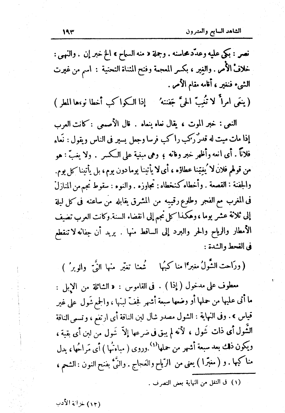 وَكَانَت الْعَرَب تضيف الأمطار والرياح وَالْحر وَالْبرد إِلَى السَّاقِط مِنْهَا يُرِيد أَن جفانه لَا تَنْقَطِع فِي الْقَحْط والشدة ... وراحت الشول مغبرا مناكبها ... شعثا تغير مِنْهَا الني والوبر)