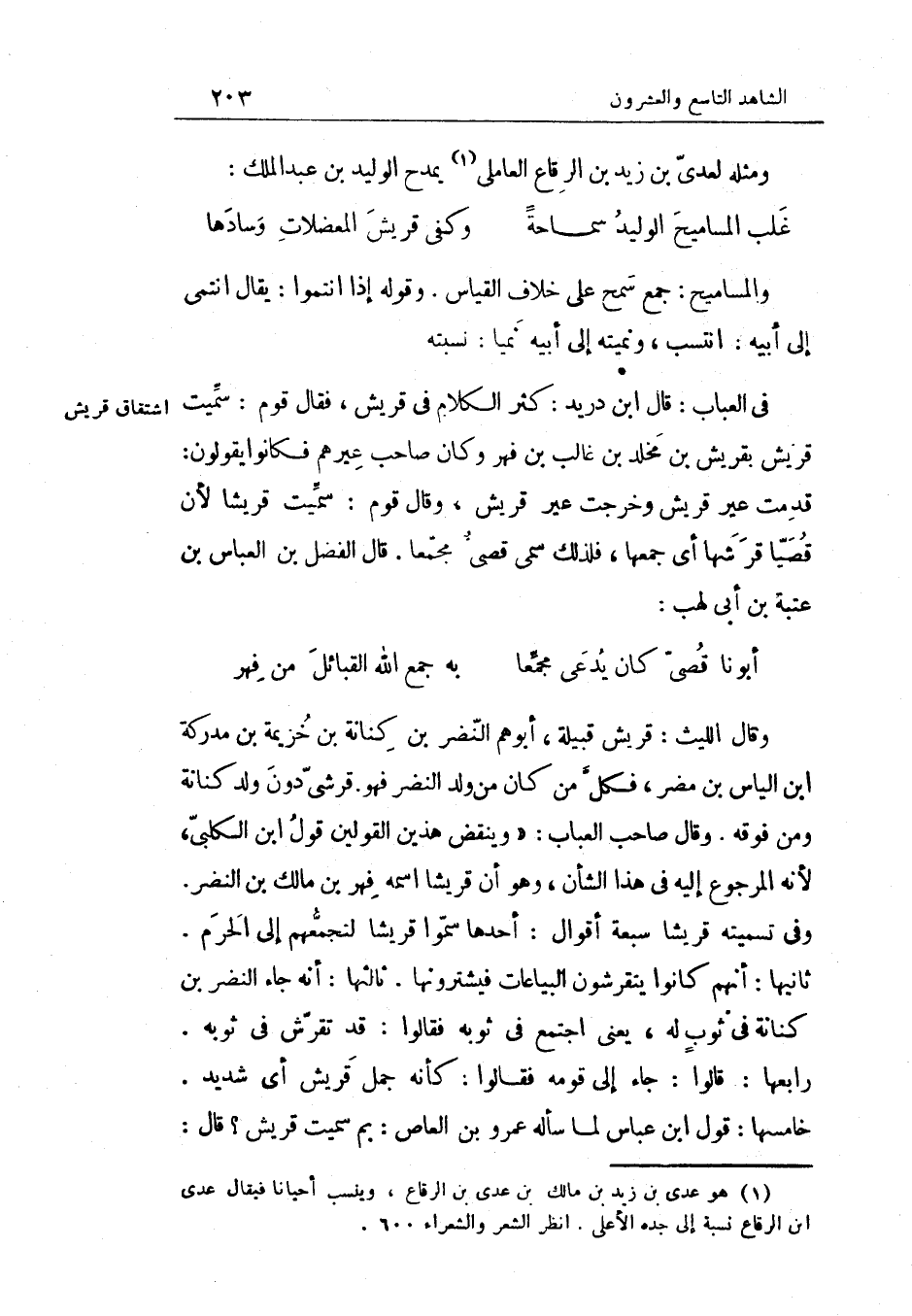 والمساميح جمع سمح على خلاف الْقيَاس وَقَوله إِذا انتموا يُقَال انْتَمَى إِلَى أَبِيه انتسب ونميته إِلَى أَبِيه نميا نسبته فِي الْعباب قَالَ ابْن دُرَيْد كثر الْكَلَام فِي قُرَيْش فَقَالَ قوم سميت قُرَيْش بِقُرَيْش بن مخلد بن غَالب بن فهر وَكَانَ صَاحب عيرهم فَكَانُوا يَقُولُونَ قدمت عير قُرَيْش وَخرجت عير قُرَيْش وَقَالَ قوم سميت قُريْشًا لِأَن قصيا قرشها أَي جمعهَا فَلذَلِك سمي قصي مجمعا قَالَ الْفضل)