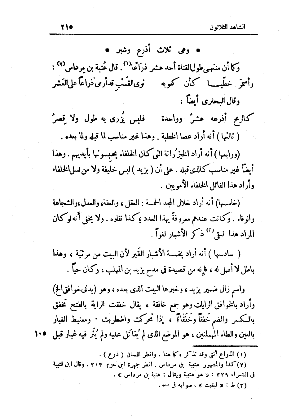 ثَالِثهَا أَنه أَرَادَ عَصا الْخطْبَة وَهَذَا غير مُنَاسِب لما قبله وَلما بعده وَرَابِعهَا أَنه أَرَادَ الخيزرانة الَّتِي كَانَ الْخُلَفَاء يحبسونها بِأَيْدِيهِم وَهَذَا أَيْضا غير مُنَاسِب كَالَّذي قبله على أَن يزِيد لَيْسَ خَليفَة وَلَا من نسل الْخُلَفَاء وَأَرَادَ هَذَا الْقَائِل الْخُلَفَاء الأمويين خَامِسهَا أَنه أَرَادَ خلال الْمجد الْخَمْسَة الْعقل والعفة وَالْعدْل والشجاعة وَالْوَفَاء وَكَانَت عِنْدهم مَعْرُوفَة بِهَذَا الْعدَد كَذَا نقلوه وَلَا يخفى أَنه لَو كَانَ المُرَاد هَذَا لبقي ذكر الأشبار لَغوا سادسها أَنه أَرَادَ بِخَمْسَة الأشبار الْقَبْر لِأَن الْبَيْت من مريثة وَهَذَا بَاطِل لَا أصل لَهُ فَإِنَّهُ من قصيدة فِي مدح يزِيد بن الْمُهلب وَكَانَ حَيا وَاسم زَالَ ضمير يزِيد وخبرها الْبَيْت الَّذِي بعده وَهُوَ يدني خوافق إِلَخ وَأَرَادَ بالخوافق الرَّايَات وَهُوَ جمع خافقة يُقَال خَفَقت الرَّايَة بِالْفَتْح تخفق