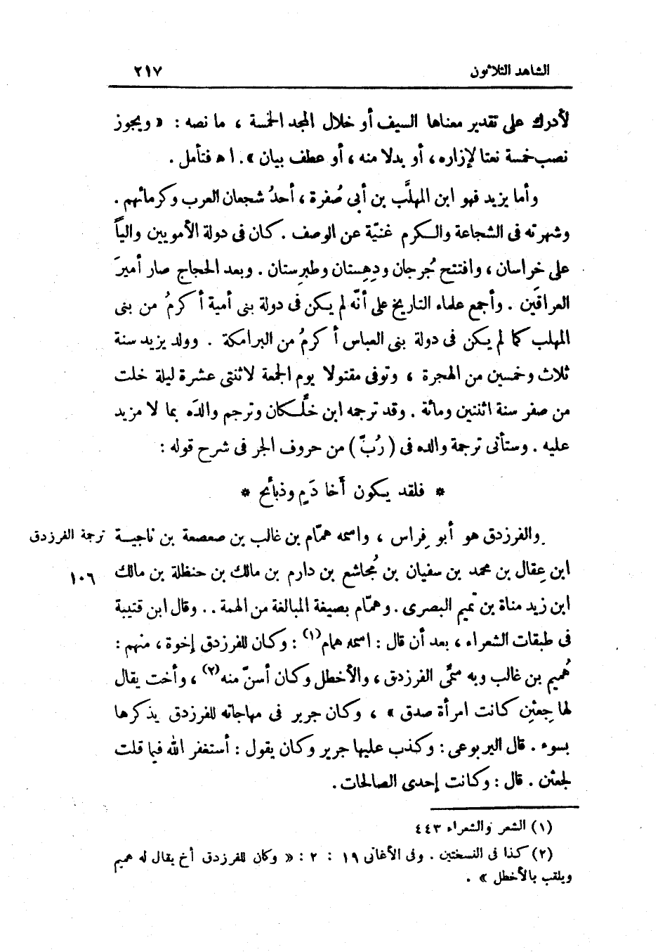 وَأما يزِيد فَهُوَ ابْن الْمُهلب بن أبي صفرَة أحد شجعان الْعَرَب وكرمائهم وشهرته فِي الشجَاعَة وَالْكَرم غنية عَن الْوَصْف كَانَ فِي دولة الأمويين واليا على خُرَاسَان وافتتح جرجان ودهستان وطبرستان وَبعد الْحجَّاج صَار أَمِير العراقين وَأجْمع عُلَمَاء التَّارِيخ على أَنه لم يكن فِي دولة بني أُميَّة أكْرم من بني الْمُهلب كَمَا لم يكن فِي دولة بني الْعَبَّاس أكْرم من البرامكة وَولد يزِيد سنة ثَلَاث وَخمسين من الْهِجْرَة وَتُوفِّي مقتولا يَوْم الْجُمُعَة لِاثْنَتَيْ عشرَة لَيْلَة خلت من صفر سنة اثْنَتَيْنِ وَمِائَة وَقد تَرْجمهُ ابْن خلكان وَترْجم وَالِده بِمَا لَا مزِيد عَلَيْهِ وستاتي تَرْجَمَة وَالِده فِي رب من حُرُوف الْجَرّ فِي شرح قَوْله (الْكَامِل)