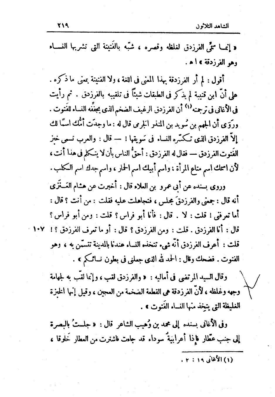 تكسره النِّسَاء فِي سويقها قَالَ وَالْعرب تسمي خبز الفتوت الفرزدق فَقَالَ لَهُ الفرزدق أَحَق النَّاس بِأَن لَا يتَكَلَّم فِي هَذَا أَنْت لِأَن أسمك اسْم مَتَاع الْمَرْأَة وَاسم أَبِيك اسْم الْحمار وَاسم جدك اسْم الْكَلْب وروى بِسَنَدِهِ عَن أبي عَمْرو بن الْعَلَاء قَالَ أخْبرت عَن هِشَام الْعَنزي أَنه قَالَ جمعني والفرزدق مجْلِس فتجاهلت عَلَيْهِ فَقلت من أَنْت قَالَ أما تعرفنِي قلت لَا قَالَ فَأَنا أَبُو فراس قلت وَمن أَبُو فراس قَالَ أَنا الفرزدق قلت وَمن الفرزدق قَالَ أَو مَا تعرف الفرزدق قلت أعرف الفرزدق أَنه شَيْء تتخذه النِّسَاء عندنَا بِالْمَدِينَةِ تتسمن بِهِ وَهُوَ الفتوت فَضَحِك وَقَالَ الْحَمد لله الَّذِي جعلني فِي بطُون نِسَائِكُم وَقَالَ السَّيِّد المرتضي فِي أمالية والفرزدق لقب وَإِنَّمَا لقب بِهِ لجهامة وَجهه وغلظة لِأَن الفرزدقة هِيَ الْقطعَة الضخمة من الْعَجِين وَقيل إِنَّهَا الخبزة الغليظة الَّتِي يتَّخذ مِنْهَا النِّسَاء الفتوت وَفِي الأغاني بِسَنَدِهِ إِلَى مُحَمَّد بن وهيب الشَّاعِر قَالَ جَلَست بِالْبَصْرَةِ إِلَى جنب عطار فَإِذا أعرابية سَوْدَاء قد جَاءَت فاشترت من الْعَطَّار خلوقا