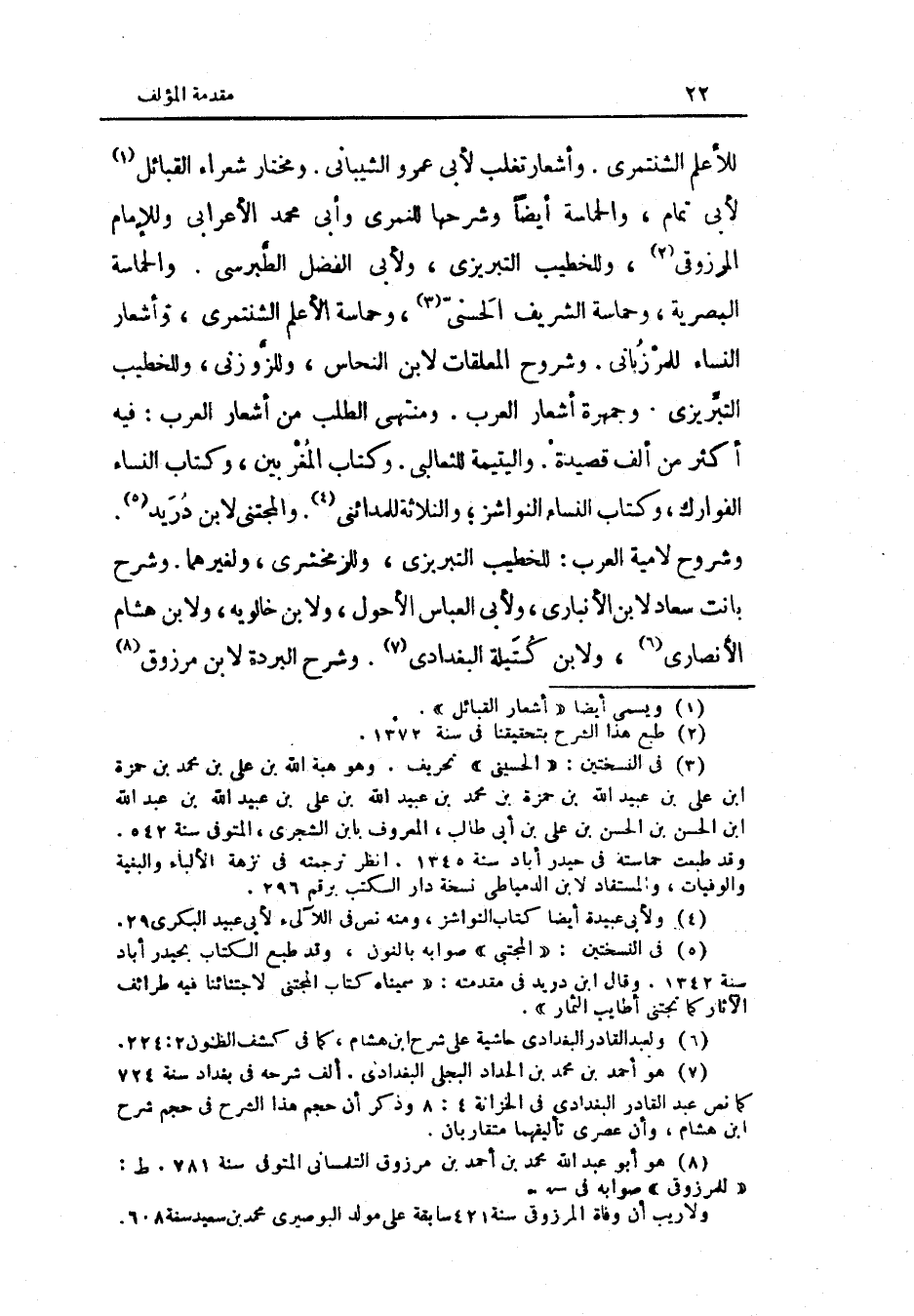 لأبي تَمام والحماسة أَيْضا وَشَرحهَا للنمري وَأبي مُحَمَّد الْأَعرَابِي وَللْإِمَام المرزوقي وللخطيب التبريزي وَلأبي الْفضل الطبرسي والحماسة البصرية وحماسة الشريف الحسني وحماسة الأعلم الشنتمري وأشعار النِّسَاء للمرزباني وشروح المعلقات لِابْنِ النّحاس وللزوزني وللخطيب التبريزي وجمهرة أشعار الْعَرَب ومنتهى الطّلب من أشعار الْعَرَب فِيهِ أَكثر من ألف قصيدة واليتيمة للثعالبي وَكتاب المغربين وَكتاب النِّسَاء الفوارك وَكتاب النِّسَاء النواشز وَالثَّلَاثَة للمدائني والمجتنى لِابْنِ دُرَيْد وشروح لأمية الْعَرَب للخطيب التبريزي وللزمخشري ولغيرهما وَشرح بَانَتْ سعاد لِابْنِ الْأَنْبَارِي وَلأبي الْعَبَّاس الْأَحول وَلابْن خالويه وَلابْن هِشَام الْأنْصَارِيّ وَلابْن كتيلة الْبَغْدَادِيّ وَشرح الْبردَة لِابْنِ مَرْزُوق
