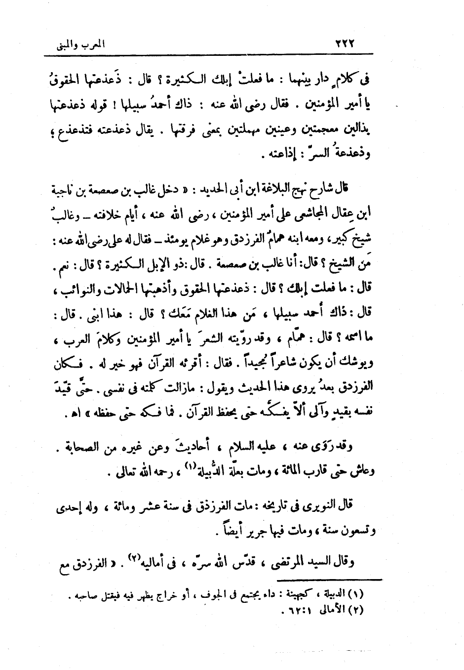 فِي كَلَام دَار بَينهمَا مَا فعلت إبلك الْكَثِيرَة قَالَ ذعذعتها الْحُقُوق يَا أَمِير الْمُؤمنِينَ فَقَالَ رَضِيَ اللَّهُ عَنْه ذَاك أَحْمد سَبِيلهَا قَوْله ذعذعتها بذالين معجمتين وعينين مهملتين بِمَعْنى فرقتها يُقَال ذعذعته فتذعذع وذعذعة السِّرّ إذاعته قَالَ شَارِح نهج البلاغة ابْن أبي الْحَدِيد دخل غَالب بن صعصعة بن نَاجِية بن عقال الْمُجَاشِعِي على أَمِير الْمُؤمنِينَ رَضِيَ اللَّهُ عَنْه أَيَّام خِلَافَته وغالب شيخ كَبِير وَمَعَهُ أبنه همام الفرزدق وَهُوَ غُلَام يَوْمئِذٍ فَقَالَ لَهُ عَليّ رَضِيَ اللَّهُ عَنْه من الشَّيْخ قَالَ أَنا غَالب بن صعصعة قَالَ ذُو الْإِبِل الْكَثِيرَة قَالَ نعم قَالَ مَا فعلت إبلك قَالَ ذعذعتها الْحُقُوق وأذهبتها الحمالات والنوائب قَالَ ذَاك أَحْمد سَبِيلهَا من هَذَا الْغُلَام مَعَك قَالَ هَذَا ابْني قَالَ مَا اسْمه قَالَ همام وَقد رويته الشّعْر يَا أَمِير الْمُؤمنِينَ وَكَلَام الْعَرَب ويوشك أَن يكون شَاعِرًا مجيدا فَقَالَ أقرئه الْقُرْآن فَهُوَ خير لَهُ فَكَانَ الفرزدق بعد يروي هَذَا الحَدِيث وَيَقُول مَا زَالَت كَلمته فِي نَفسِي حَتَّى قيد نَفسه بِقَيْد وآلى أَلا يفكه حَتَّى يحفظ الْقُرْآن فَمَا فكة حَتَّى حفظه 1. وَقد روى عَنهُ عَلَيْهِ السَّلَام أَحَادِيث وَعَن غَيره من الصَّحَابَة وعاش حَتَّى قَارب الْمِائَة وَمَات بعلة الدُّبَيْلَة رَحِمَهُ اللَّهُ تَعَالَى قَالَ النويري فِي تَارِيخه مَاتَ الفرزدق فِي سنة عشر وَمِائَة وَله إِحْدَى وَتسْعُونَ سنة وَمَات فِيهَا جرير أَيْضا وَقَالَ السَّيِّد المرتضي قدس الله سره فِي أَمَالِيهِ الفرزدق مَعَ