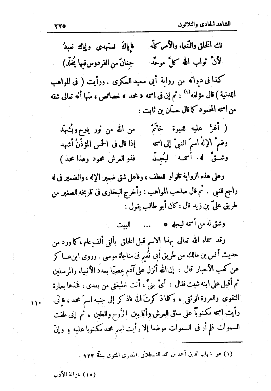 كَذَا فِي ديوانه من رِوَايَة أبي سعيد السكرِي وَرَأَيْت فِي الْمَوَاهِب اللدنية قَالَ مؤلفة ثمَّ إِن فِي اسْمه مُحَمَّد خَصَائِص مِنْهَا أَنه تَعَالَى شقَّه من اسْمه الْمَحْمُود كَمَا قَالَ حسان بن ثَابت (الطَّوِيل)