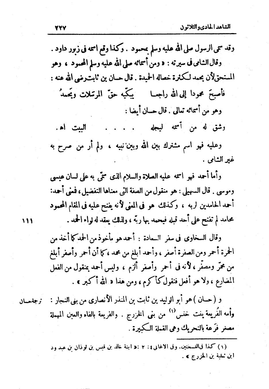 الْمَحْمُود وَهُوَ الْمُسْتَحق لِأَن يحمد لِكَثْرَة خصالة الحميدة قَالَ حسان بن ثَابت رَضِيَ اللَّهُ عَنْه (الطَّوِيل)