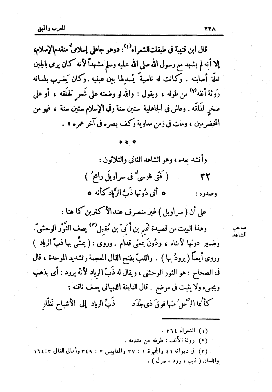 مشهدا لِأَنَّهُ كَانَ يرْمى بالجبن لعِلَّة أَصَابَته وَكَانَت لَهُ نَاصِيَة يسدلها بَين عَيْنَيْهِ وَكَانَ يضْرب بِلِسَانِهِ روثه أَنفه من طوله وَيَقُول وَالله لَو وَضعته على شعر لحلقه أَو على صَخْر لفلقة وعاش فِي الْجَاهِلِيَّة سِتِّينَ سنة وَفِي الْإِسْلَام سِتِّينَ سنة فَهُوَ من المخضرمين وَمَات فِي زمن مُعَاوِيَة وكف بَصَره فِي آخر عمْرَة وَأنْشد بعده وَهُوَ الشَّاهِد الثَّانِي وَالثَّلَاثُونَ (الطَّوِيل)