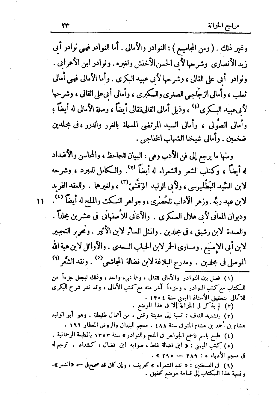 الزجاجي الصُّغْرَى والكبرى وأمالي أبي عَليّ القالي وَشَرحهَا لأبي عبيد الْبكْرِيّ وذيل أمالي القالي للقالي أَيْضا وصلَة ذيل الأمالي لَهُ أَيْضا وأمالي الصولي وأمالي السَّيِّد المرتضى الْمُسَمَّاة بالغرر والدرر فِي مجلين ضخمين وأمالي شَيخنَا الشهَاب الخفاجي وَمِنْهَا مَا يرجع إِلَى فن الْأَدَب وَهِي الْبَيَان للجاحظ والمحاسن والأضداد لَهُ أَيْضا وَكتاب الشّعْر وَالشعرَاء لَهُ أَيْضا والكامل للمبرد وَشَرحه لِابْنِ السَّيِّد البطليوسي وَلأبي الْوَلِيد الوقشي ولغيرهما وَالْعقد الفريد لِابْنِ عبد ربه وزهر الْآدَاب للحصري وجواهر النكت وَالْملح لَهُ أَيْضا وديوان الْمعَانِي لأبي هِلَال العسكري والأغاني للأصفهاني فِي عشْرين مجلدا والعمدة لِابْنِ رَشِيق فِي مجلدين والمثل السائر لِابْنِ الْأَثِير وتحرير التحبير لِابْنِ أبي الإصبع ومساوي الْخمر لِابْنِ الْحباب السَّعْدِيّ والأوائل لِابْنِ هبة الله الْموصِلِي فِي مجلدين ومدرج البلاغة لِابْنِ فضَالة الْمُجَاشِعِي وَنقد الشّعْر