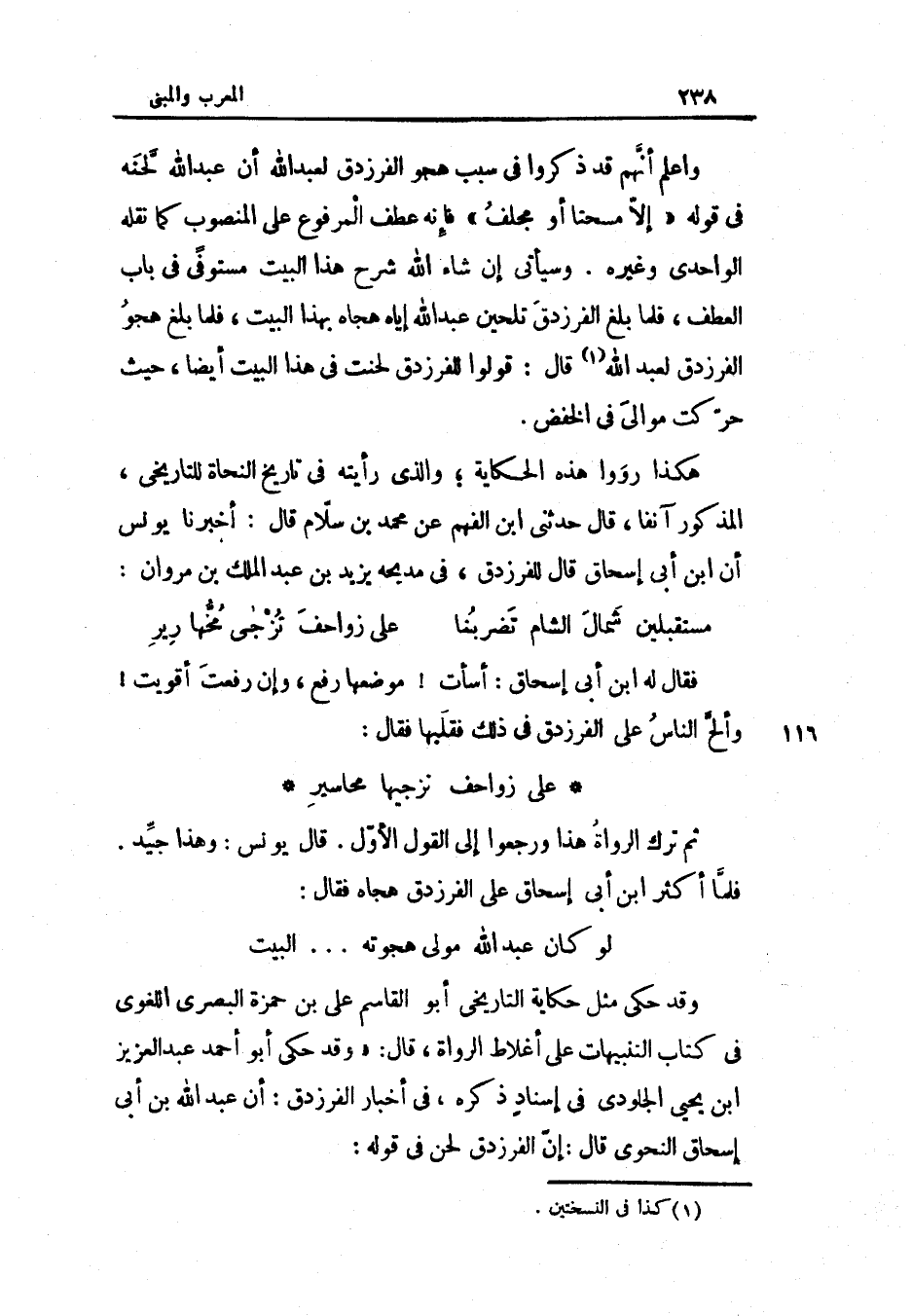 ثمَّ ترك الروَاة هَذَا وَرَجَعُوا إِلَى القَوْل الأول قَالَ يُونُس وَهَذَا جيد فَلَمَّا أَكثر ابْن أبي إِسْحَاق على الفرزدق هجاه فَقَالَ