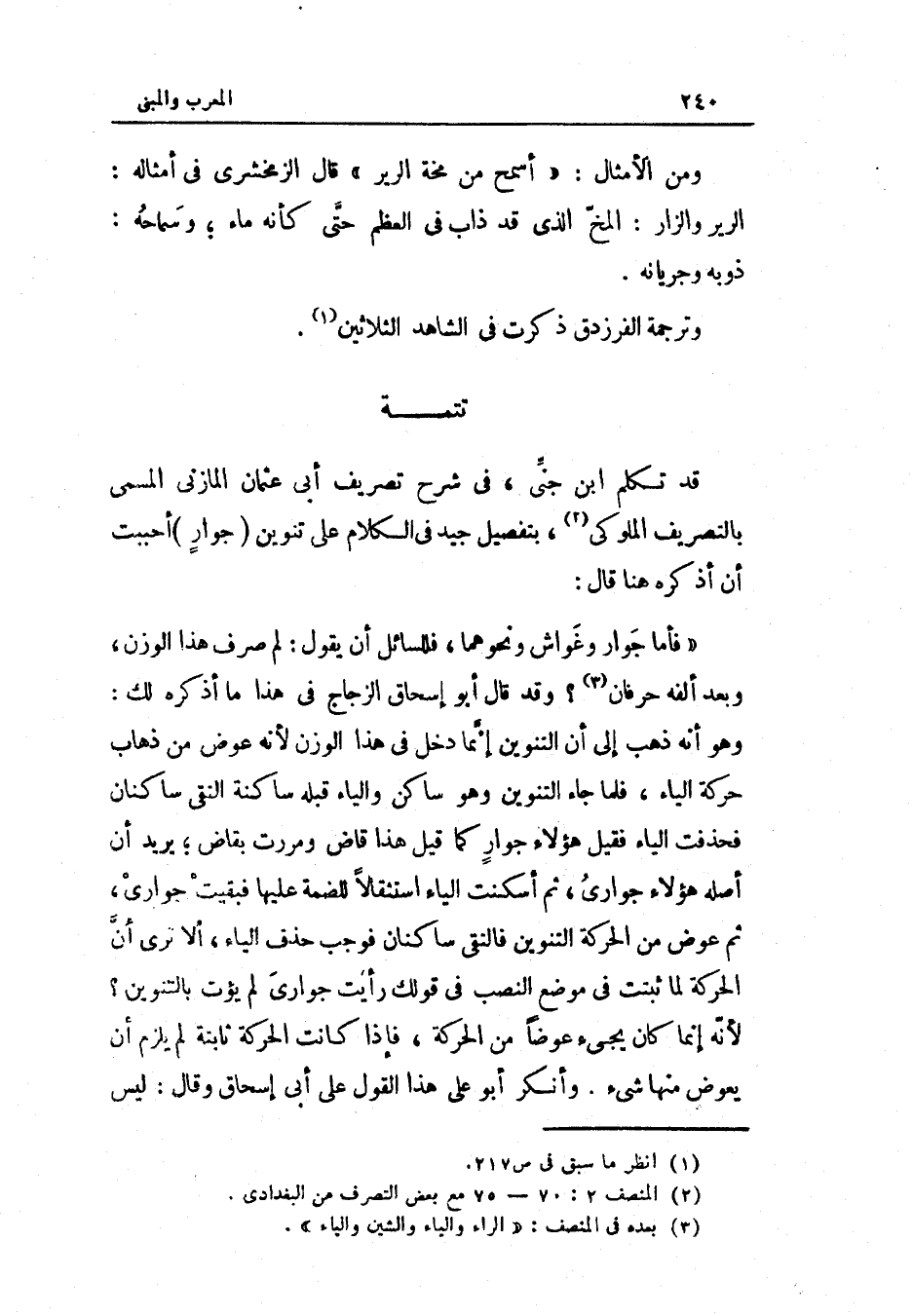 قد تكلم ابْن جني فِي شرح تصريف أبي عُثْمَان الْمَازِني الْمُسَمّى بالتصريف الملوكي بتفصيل جيد فِي الْكَلَام على تَنْوِين جوَار أَحْبَبْت أَن أذكرهُ هُنَا قَالَ فَأَما جوَار وغواش وَنَحْوهمَا فللسائل أَن يَقُول لم صرف هَذَا الْوَزْن وَبعد