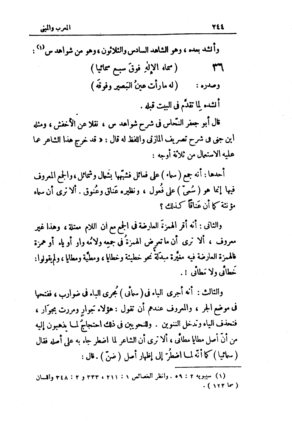 أنْشدهُ لما تقدم فِي الْبَيْت قبله قَالَ أَبُو جَعْفَر النّحاس فِي شرح شَوَاهِد س نقلا عَن الْأَخْفَش وَمثله ابْن جني فِي شرح تصريف الْمَازِني وَاللَّفْظ لَهُ قَالَ قد خرج هَذَا الشَّاعِر عَمَّا عَلَيْهِ الِاسْتِعْمَال من ثَلَاثَة أوجه أَحدهَا أَنه جمع سَمَاء على فعائل فشبهها بشمال وشمائل وَالْجمع الْمَعْرُوف فِيهَا إِنَّمَا هُوَ سمي على فعول وَنَظِيره عنَاق وعنوق أَلا ترى أَن سَمَاء مُؤَنّثَة كَمَا أَن عنَاقًا كَذَلِك وَالثَّانِي أَنه أقرّ الْهمزَة الْعَارِضَة فِي الْجمع مَعَ أَن اللَّام معتلة وَهَذَا غير مَعْرُوف أَلا ترى أَن مَا تعرض الْهمزَة فِي جمعه ولامه وَاو أَو يَاء أَو همزَة فالهمزة الْعَارِضَة فِيهِ مُغيرَة مبدلة نَحْو خَطِيئَة وخطايا ومطية ومطايا وَلم يَقُولُوا خطائي وَلَا مطائي