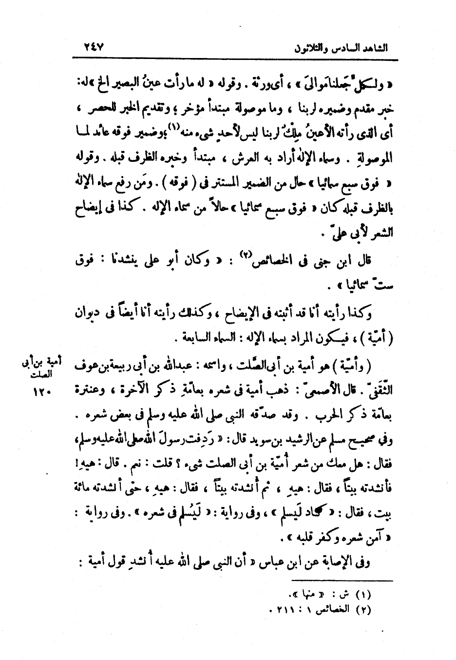 2 - وَلكُل جعلنَا موَالِي} أَي وَرَثَة وَقَوله لَهُ مَا رَأَتْ عين الْبَصِير إِلَخ لَهُ خبر مقدم وضميره لربنا وَمَا مَوْصُولَة مُبْتَدأ مُؤخر وَتَقْدِيم الْخَبَر للحصر أَي الَّذِي رَأَتْهُ الْأَعْين ملك لربنا لَيْسَ لأحد شَيْء مِنْهُ وَضمير فَوْقه عَائِد ل مَا الموصولة وسماء الْإِلَه أَرَادَ بِهِ الْعَرْش مبتدا وَخَبره الظّرْف قبله وَقَوله فَوق سبع سمائيا حَال من الضَّمِير الْمُسْتَتر فِي فَوْقه وَمن رفع سَمَّاهُ الْإِلَه بالظرف قبله كَانَ فَوق سبع سمائيا حَالا من سَمَاء الْإِلَه كَذَا فِي إِيضَاح الشّعْر لأبي عَليّ قَالَ ابْن جني فِي الخصائص وَكَانَ أَبُو عَليّ ينشدنا فَوق سِتّ سمائيا وَكَذَا رَأَيْته أَنا قد أثْبته فِي الْإِيضَاح وَكَذَلِكَ رَأَيْته أَنا أَيْضا فِي ديوَان أُميَّة فَيكون المُرَاد بسماء الْإِلَه السَّمَاء السَّابِعَة وَأُميَّة هُوَ أُميَّة بن أبي الصَّلْت واسْمه عبد الله بن أبي ربيعَة بن عَوْف الثَّقَفِيّ قَالَ الْأَصْمَعِي ذهب أُميَّة فِي شعره بعامه ذكر الْآخِرَة وعنترة بعامة ذكر الْحَرْب وَقد صدقه النَّبِي