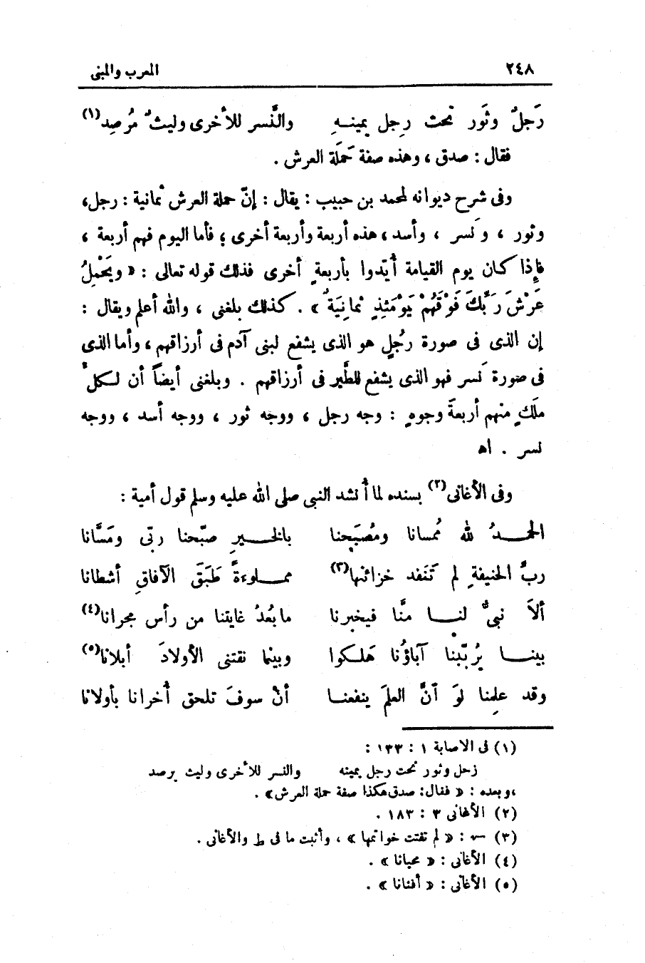 فَقَالَ صدق وَهَذِه صفة حَملَة الْعَرْش وَفِي شرح ديوانه لمُحَمد بن حبيب يُقَال أَن حَملَة الْعَرْش ثَمَانِيَة رجل وثور ونسر وَأسد هَذِه أَرْبَعَة وَأَرْبَعَة أُخْرَى فَأَما الْيَوْم فهم أَرْبَعَة فَإِذا كَانَ يَوْم الْقِيَامَة أيدوا بأَرْبعَة أُخْرَى فَذَلِك قَوْله تَعَالَى {وَيحمل عرش رَبك فَوْقهم يَوْمئِذٍ ثَمَانِيَة} كَذَلِك بَلغنِي وَالله أعلم وَيُقَال إِن الَّذِي فِي صُورَة رجل هُوَ الَّذِي يشفع لبني آدم فِي أَرْزَاقهم وَأما الَّذِي فِي صُورَة نسر فَهُوَ الَّذِي يشفع للطير فِي أَرْزَاقهم وَبَلغنِي أَيْضا أَن لكل ملك مِنْهُم أَرْبَعَة وجوة وَجه رجل وَوجه ثَوْر وَوجه أَسد وَوجه نسر ا. هـ.