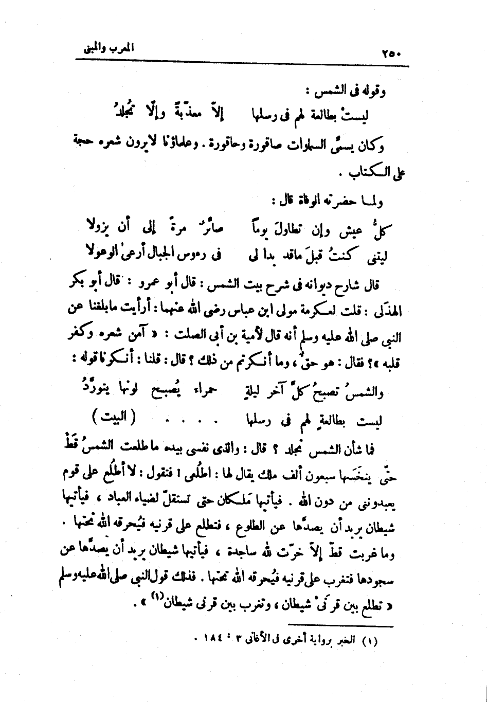 قَالَ شَارِح ديوانه فِي شرح بَيت الشَّمْس قَالَ أَبُو عَمْرو قَالَ أَبُو بكر الْهُذلِيّ قلت لعكرمة مولى ابْن عَبَّاس رَضِيَ اللَّهُ عَنْهما أَرَأَيْت مَا بلغنَا عَن النَّبِي