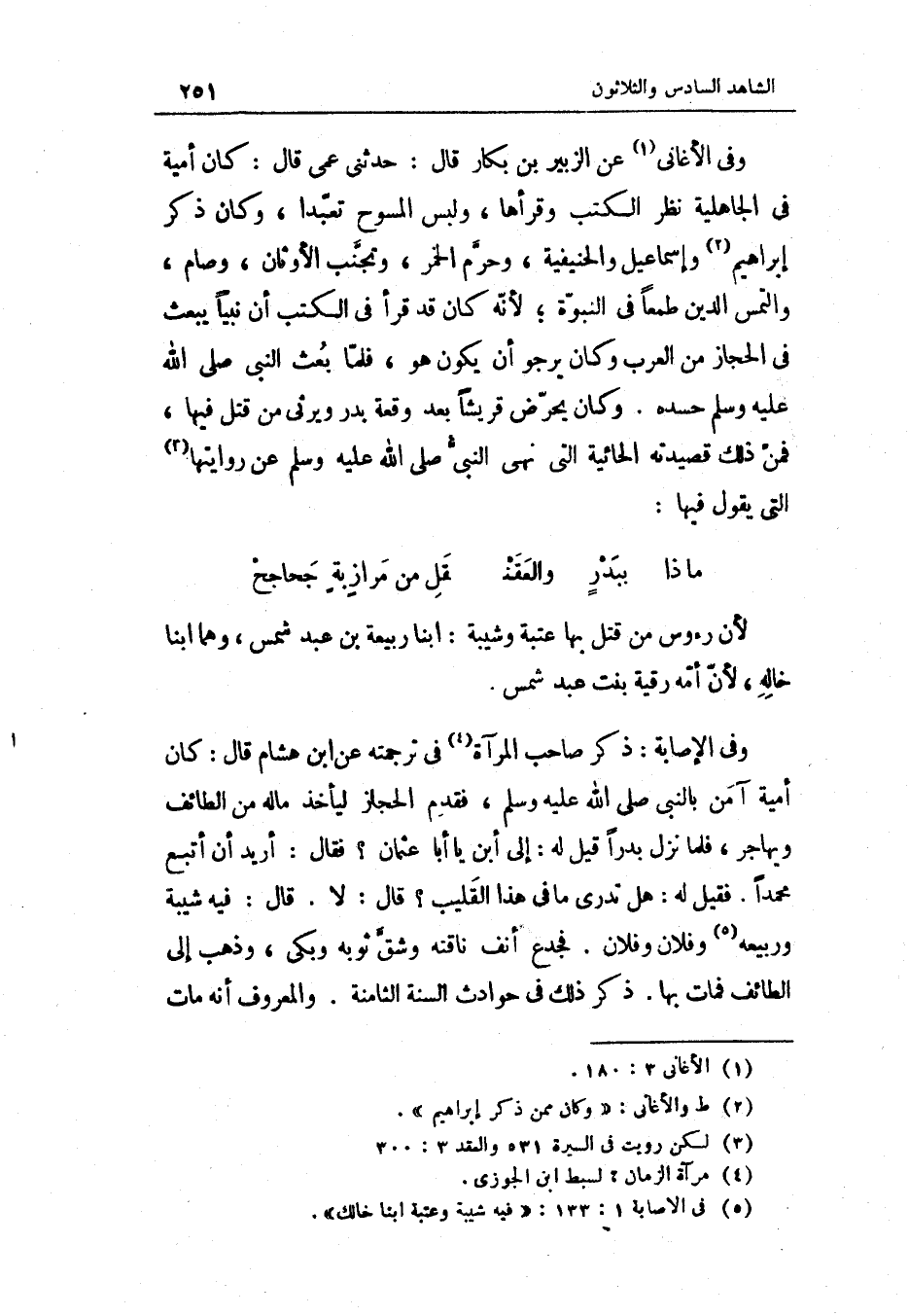 وَفِي الأغاني عَن الزبير بن بكار قَالَ حَدثنِي عمي قَالَ كَانَ أُميَّة فِي الْجَاهِلِيَّة نظر الْكتب وَقرأَهَا وَلبس المسوح تعبدا وَكَانَ مِمَّن ذكر إِبْرَاهِيم وَإِسْمَاعِيل والحنيفية وَحرم الْخمر وتجنب الْأَوْثَان وَصَامَ وَالْتمس الدَّين طَمَعا فِي النُّبُوَّة لِأَنَّهُ كَانَ قد قَرَأَ فِي الْكتب أَن نَبيا يبْعَث فِي الْحجاز من الْعَرَب وَكَانَ يَرْجُو أَن يكون هُوَ فَلَمَّا بعث النَّبِي