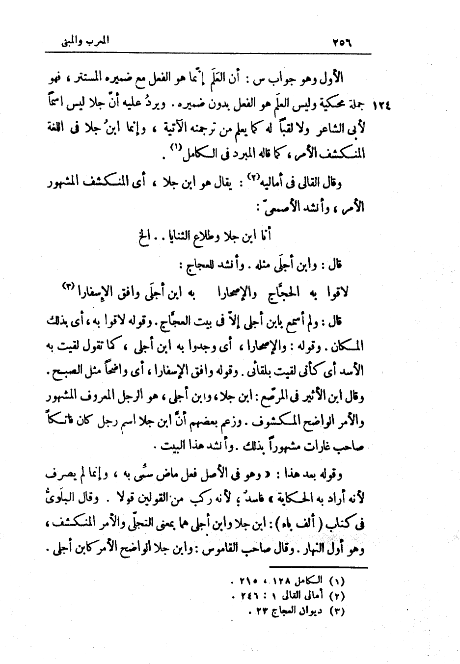 الأول وَهُوَ جَوَاب س أَن الْعلم إِنَّمَا هُوَ الْفِعْل مَعَ ضميرَة الْمُسْتَتر فَهُوَ جملَة محكية وَلَيْسَ الْعلم هُوَ الْفِعْل بِدُونِ ضَمِيره وَيرد عَلَيْهِ أَن جلا لَيْسَ اسْما لأبي الشَّاعِر وَلَا لقبا لَهُ كَمَا يعلم من تَرْجَمته الْآتِيَة وَإِنَّمَا ابْن جلا فِي اللُّغَة المنكشف الْأَمر كَمَا قَالَه الْمبرد فِي الْكَامِل وَقَالَ القالي فِي أمالية يُقَال هُوَ ابْن جلا أَي المنكشف الْمَشْهُور الْأَمر وَأنْشد الْأَصْمَعِي