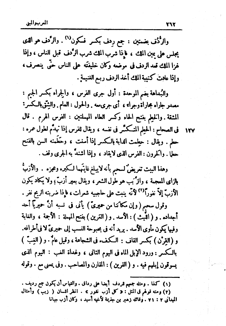 والردف بِضَمَّتَيْنِ جمع ردف بِكَسْر فَسُكُون والردف هُوَ الَّذِي يجلس على يَمِين الْملك فَإِذا شرب الْملك شرب الردف قبل النَّاس وَإِذا غزا الْملك قعد الردف فِي مَوْضِعه وَكَانَ خَلِيفَته على النَّاس حَتَّى ينْصَرف وَإِذا عَادَتْ كَتِيبَة الْملك أَخذ الردف ربع الْغَنِيمَة والبداهة بِضَم الْمُوَحدَة أول جري الْفرس والجراء بِكَسْر الْجِيم مصدر جاراه مجاراة وجراء أَي جرى مَعَه والحول الْعَام والشق بِالْكَسْرِ الْمَشَقَّة والحطم بِفَتْح الْحَاء وَكسر الطَّاء الْمُهْمَلَتَيْنِ الْفرس الْهَرم قَالَ فِي الصِّحَاح الحطم المتكسر فِي نَفسه وَيُقَال للْفرس إِذا تهدم لطول عمره حطم وَيُقَال حطمت الدَّابَّة بِالْكَسْرِ إِذا أَسِنَت وحطمته السن بِالْفَتْح حطما والحرون الْفرس الَّذِي لَا يُقَاد وَإِذا اشْتَدَّ بِهِ الجري وقف وَهَذَا الْبَيْت تَعْرِيض لسحيم بِأَنَّهُ لَا يبلغ غايتهما لكبره وعجزه والأزب بالزاي الْمُعْجَمَة والزبب هُوَ طول الشّعْر وَيُقَال بعير أزب وَلَا يكَاد يكون الأزب إِلَّا نفورا لِأَنَّهُ ينْبت على حاجبيه شَعرَات فَإِذا ضَربته الرّيح نفر وَقَول سحيم وَإِن مَكَاننَا من حميري يَأْتِي فِي نسبه أَن حميريا أحد أجداده وَاللَّيْث الْأسد والعرين بِفَتْح الْمُهْملَة الأجمة والغابة وفيهَا يكون