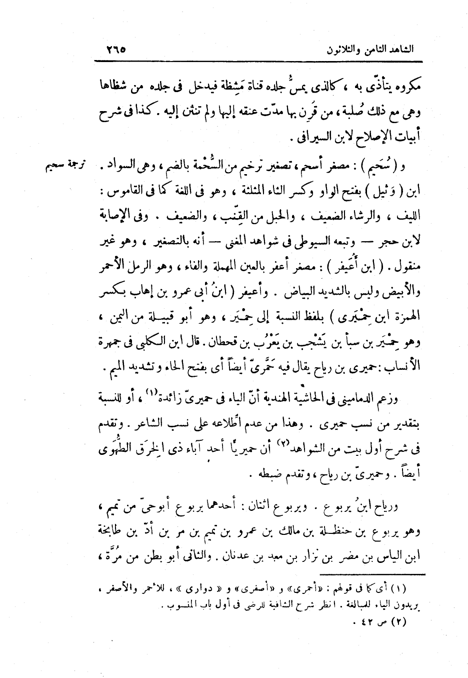 وسحيم مصغر أسحم تَصْغِير ترخيم من السحمة بِالضَّمِّ وَهِي السوَاد ابْن وثيل بِفَتْح الْوَاو وَكسر الثَّاء الْمُثَلَّثَة وَهُوَ فِي اللُّغَة كَمَا فِي الْقَامُوس الليف والرشاء الضَّعِيف وَالْحَبل من القنب والضعيف وَفِي الْإِصَابَة لِابْنِ حجر وَتَبعهُ السُّيُوطِيّ فِي شَوَاهِد المغنى أَنه بِالتَّصْغِيرِ وَهُوَ غير مَنْقُول ابْن أعيفر مصغر أعفر بِالْعينِ الْمُهْملَة وَالْفَاء وَهُوَ الرمل الْأَحْمَر والأبيض وَلَيْسَ بالشديد الْبيَاض وأعيفر ابْن أبي عَمْرو بن إهَاب بِكَسْر الْهمزَة ابْن حميري بِلَفْظ النِّسْبَة إِلَى حمير وَهُوَ أَبُو قَبيلَة من الْيمن وَهُوَ حمير بن سبأ بن يشجب بن يعرب بن قحطان قَالَ ابْن الْكَلْبِيّ فِي جمهرة الْأَنْسَاب حميري بن ريَاح يُقَال فِيهِ حمري أَيْضا أَي بِفَتْح الْحَاء وَتَشْديد الْمِيم وَزعم الدماميني فِي الْحَاشِيَة الْهِنْدِيَّة أَن الْيَاء فِي حميري زَائِدَة أَو للنسبة بِتَقْدِير من نسب حميري وَهَذَا من عدم اطِّلَاعه على نسب الشَّاعِر وَتقدم فِي شرح أول بَيت من الشواهد أَن حميريا أحد آبَاء ذِي الْخرق الطهوي أَيْضا وحميري بن ريَاح وَتقدم ضَبطه ورياح بن يَرْبُوع ويربوع اثْنَان أَحدهمَا يَرْبُوع أَبُو حَيّ من تَمِيم وَهُوَ يَرْبُوع بن حَنْظَلَة بن مَالك بن عَمْرو بن تَمِيم بن مر بن أد بن طابخة بن الياس بن مُضر ابْن نزار بن معد بن عدنان وَالثَّانِي أَبُو بطن من مرّة